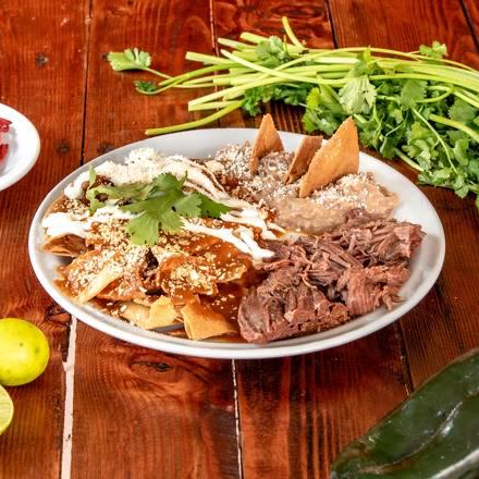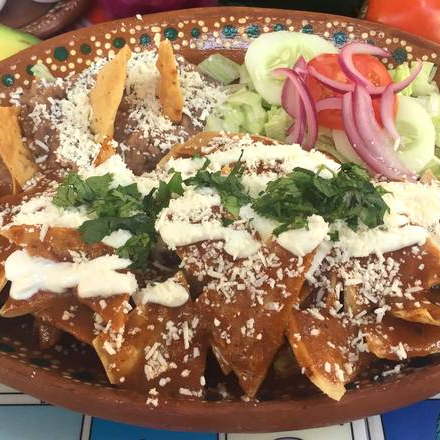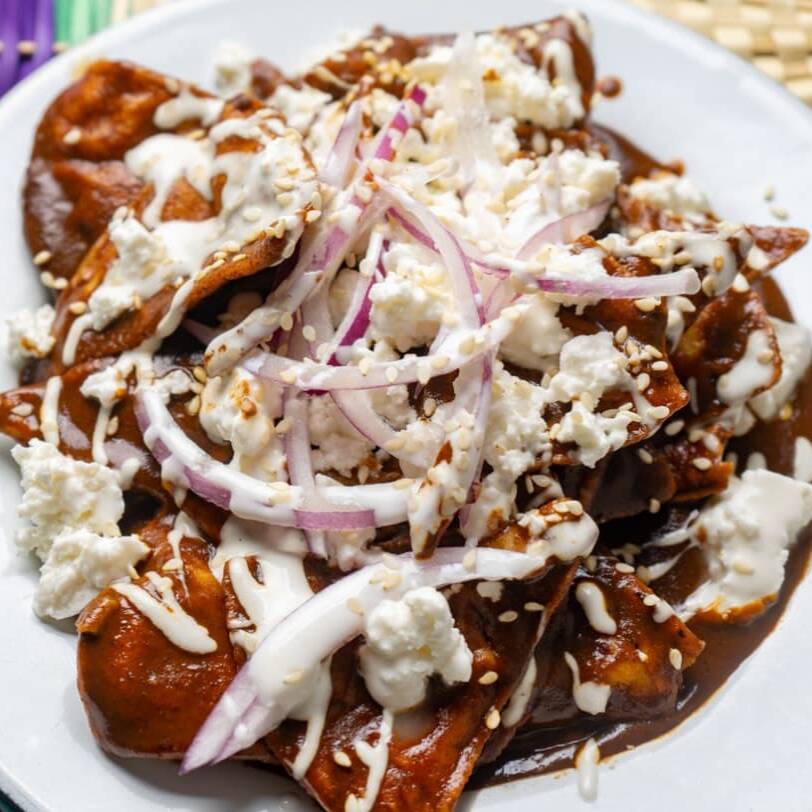 Chilaquiles cubiertos de mole poblano tradicional de nuestro mexico, sin faltar la crema y queso desmoronado.