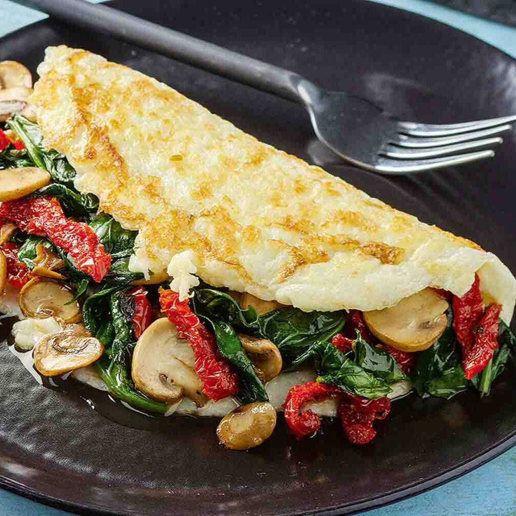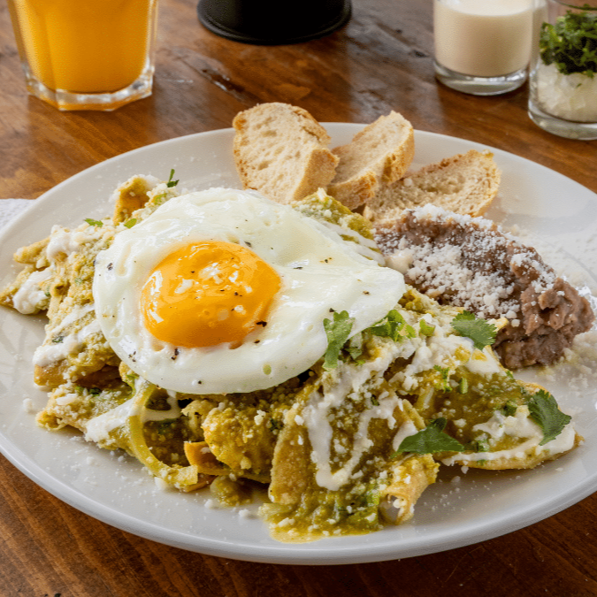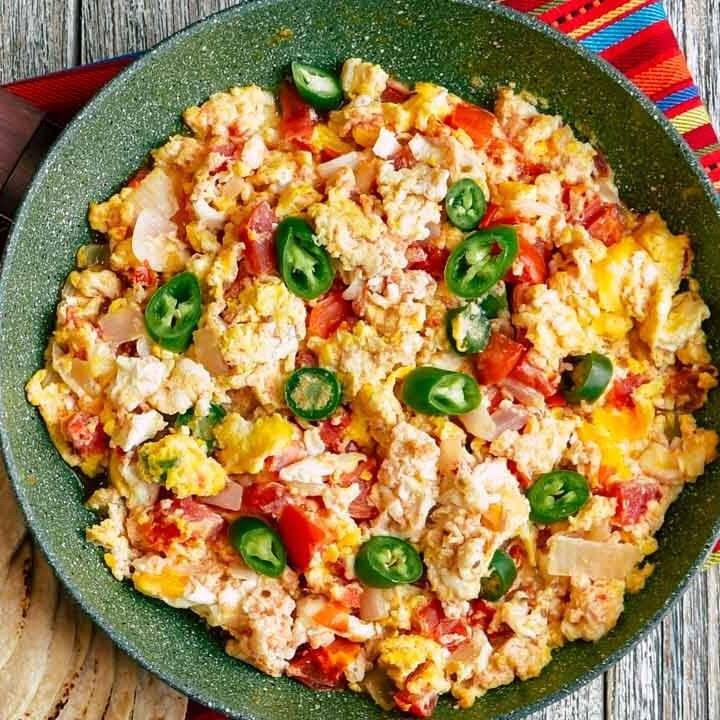 Preparados con cebolla, jitomate y chile serrano. Acompañados de frijoles refritos y queso.