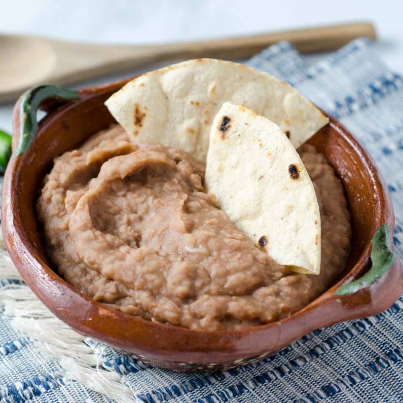 Suave pierna de cerdo adobada con el sazón de Nuestro Mexico! Cebolla dorada y frijoles refritos!