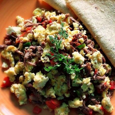 Rica carne desherbada de res guisada con jitomate cebolla y huevos.