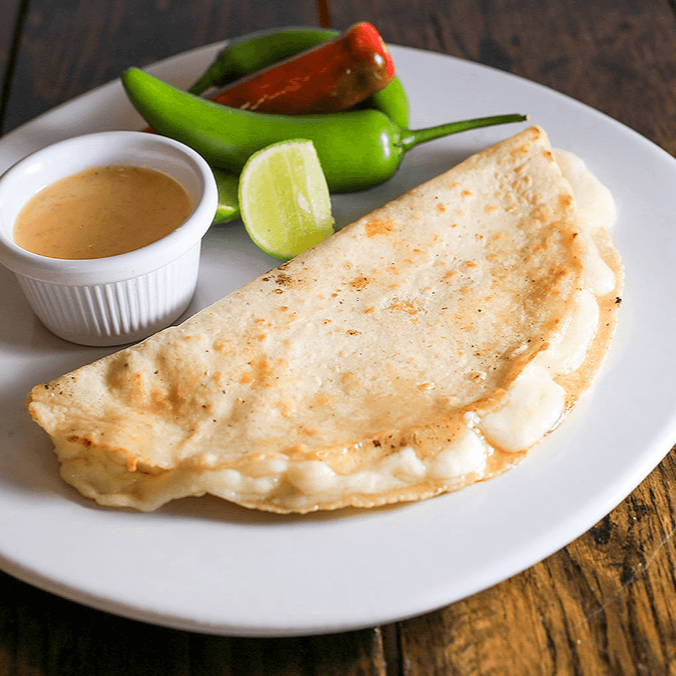 Suculenta quesadilla grande con carne de birria cebolla y cilantro.