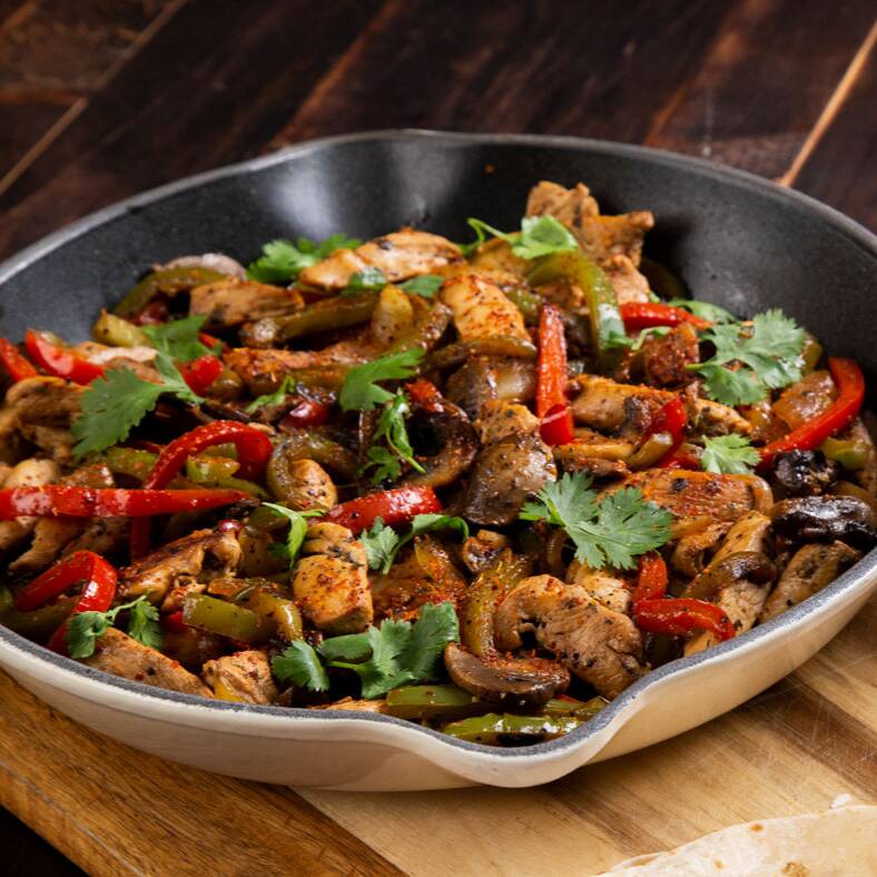 Exquisitas y jugosas tiras de carne de su elección preparadas a la cacerola con vegetales.
