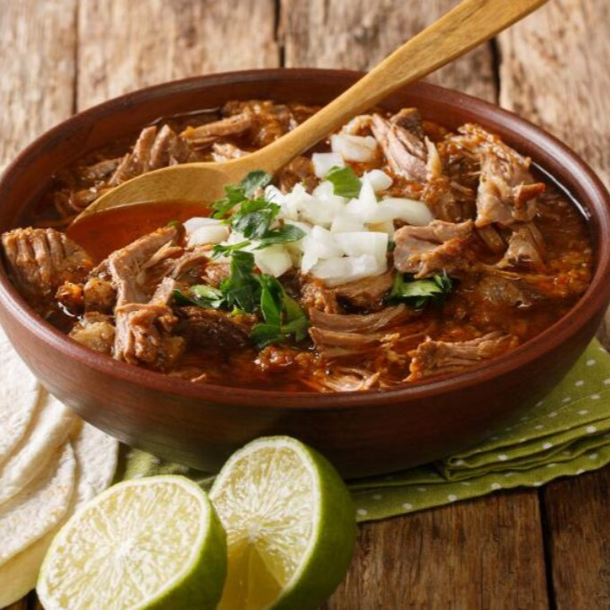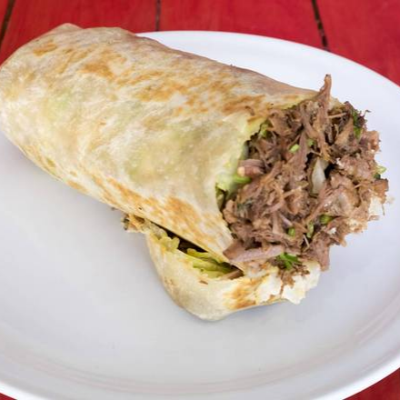 Tortilla de harina de 35 cm, rellena de carne de birria, queso cheddar, cebolla, jitomate y lechuga.