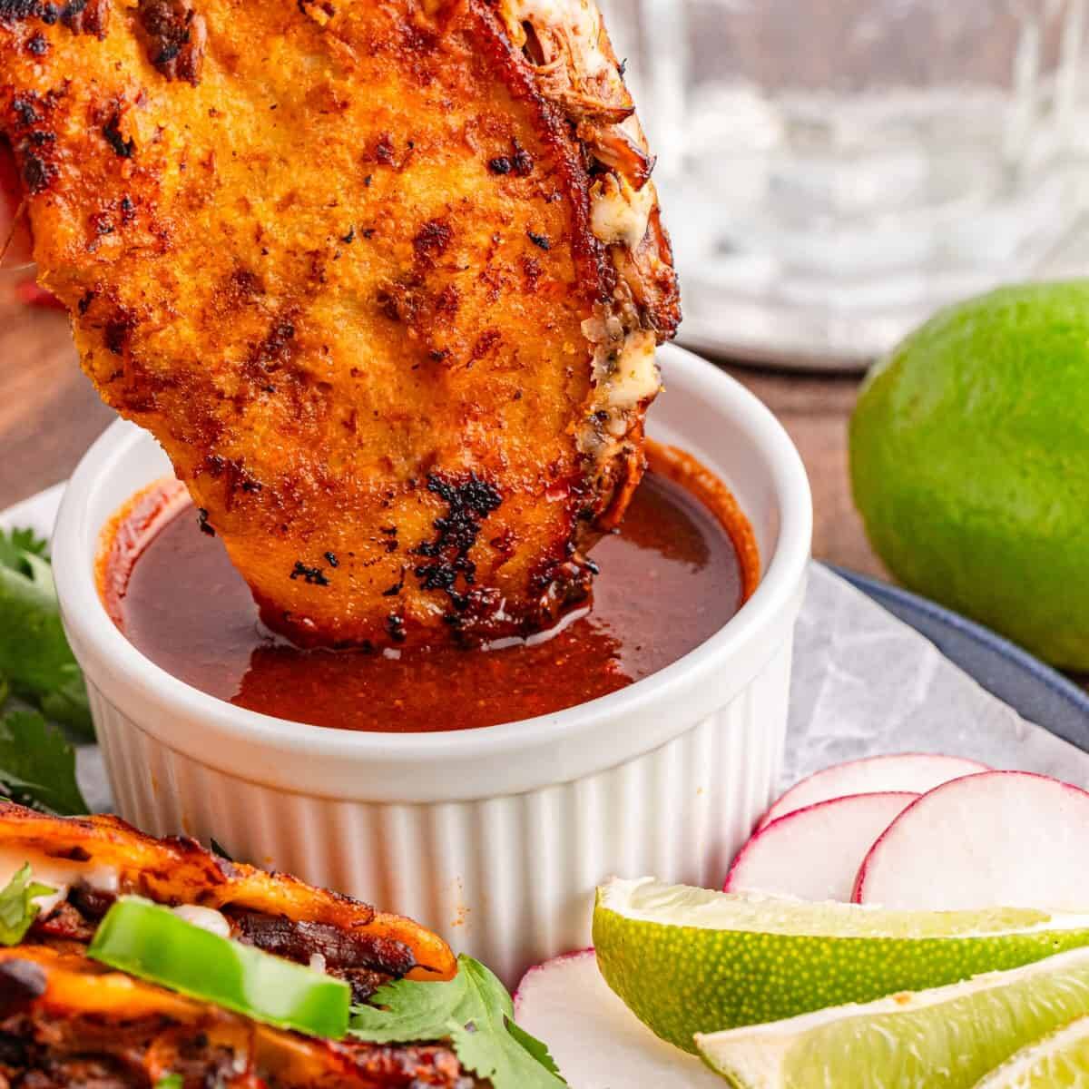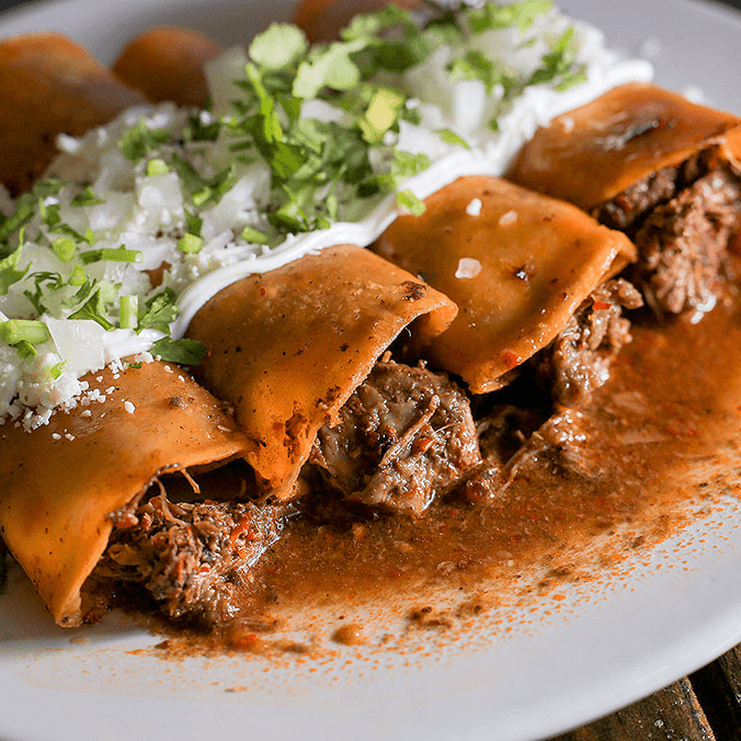 Exquisitas enchiladas rojas con sabrosa carne de birria adentro!