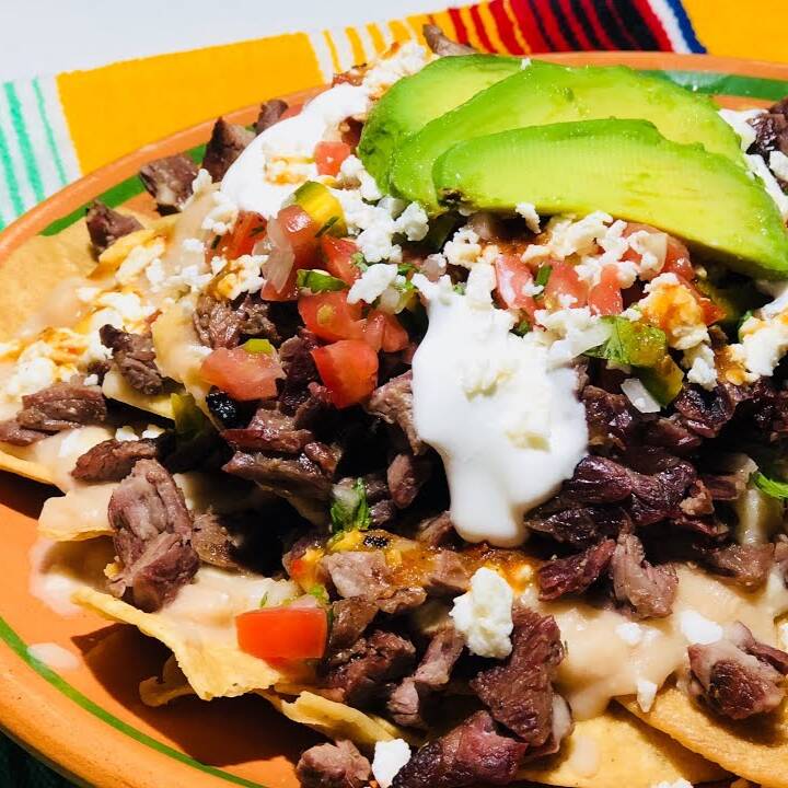 Deliciosa orden de nachos para compartir con frijoles, arrachera y queso.