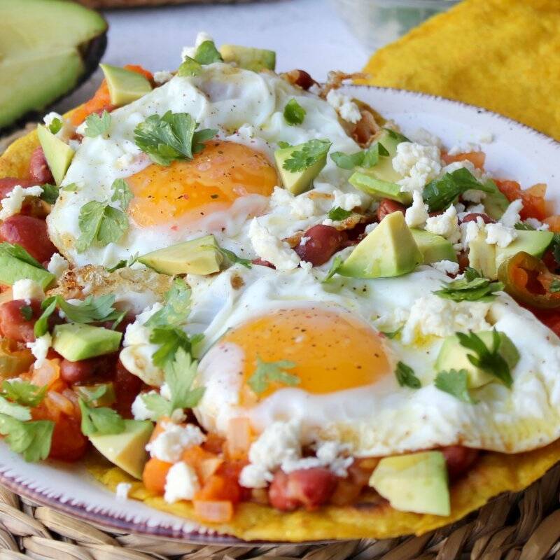 Con dos huevos estrellados. Acompañados con frijoles, queso fresco, crema y cebolla.