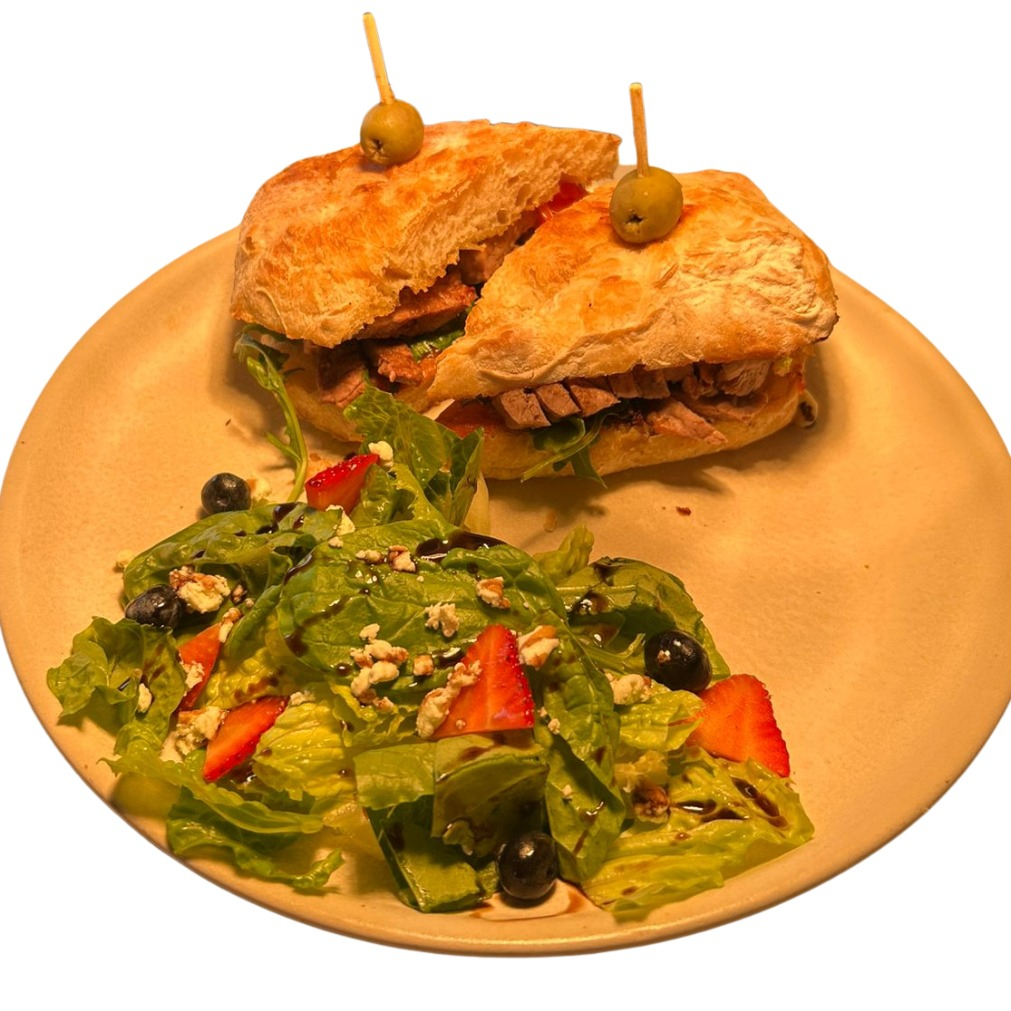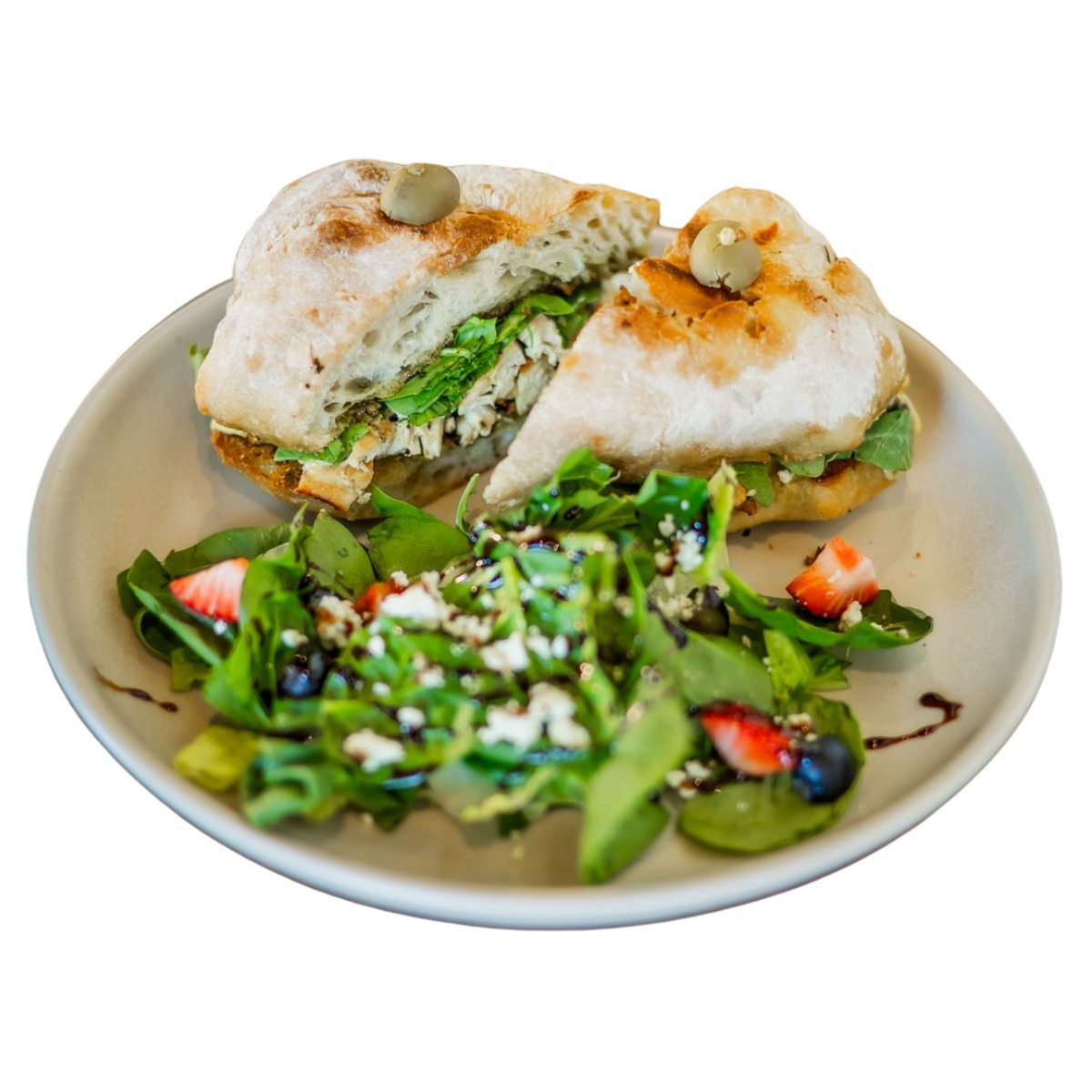 Pan ciabatta masa madre + queso + espinaca + pesto + alioli de ajo rostizado + arúgula + pollo 110gr