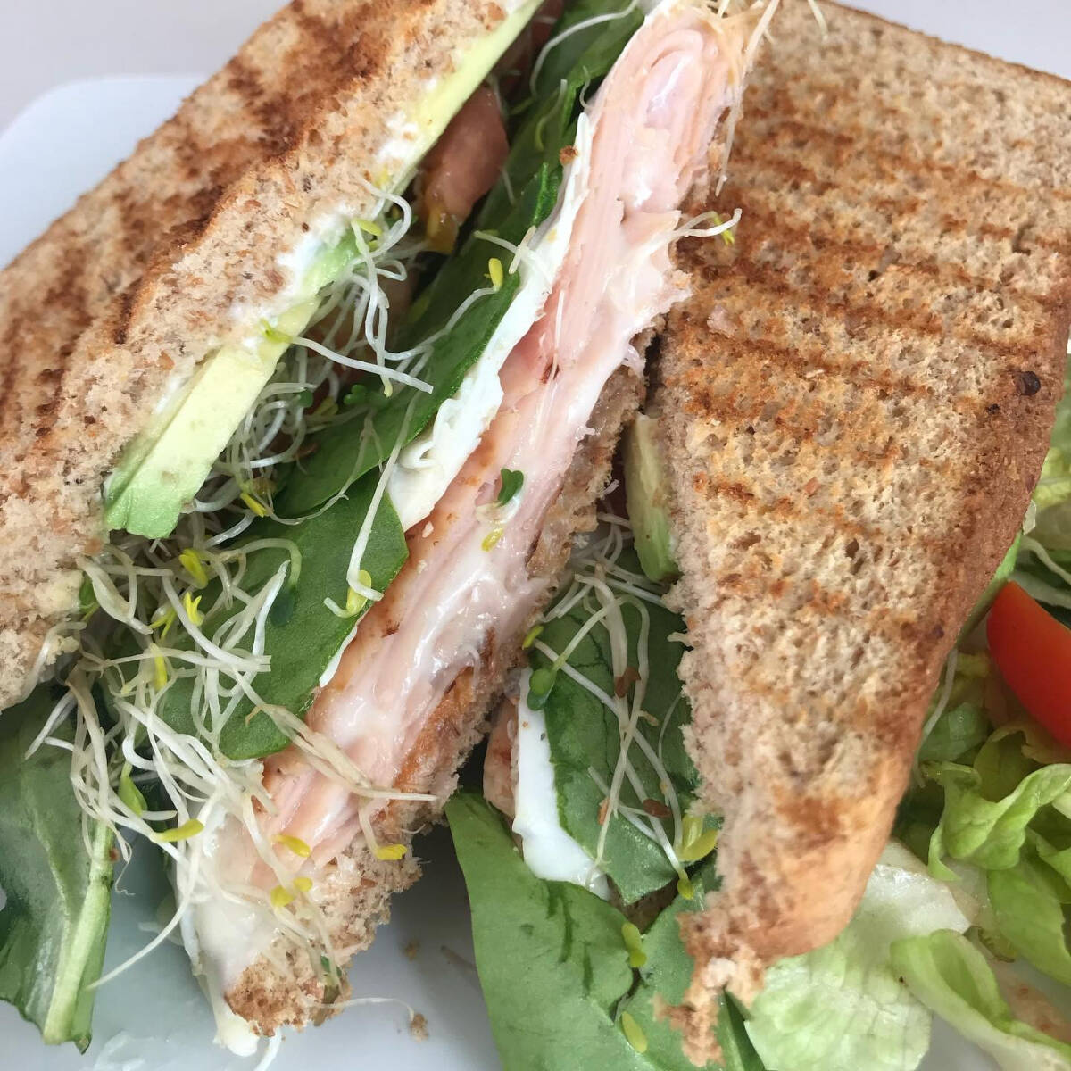 Pan de caja multigrano + jamon de pavo + queso mozzarella + espinaca + germinado de alfafa + jitomate + pepino + aguacate