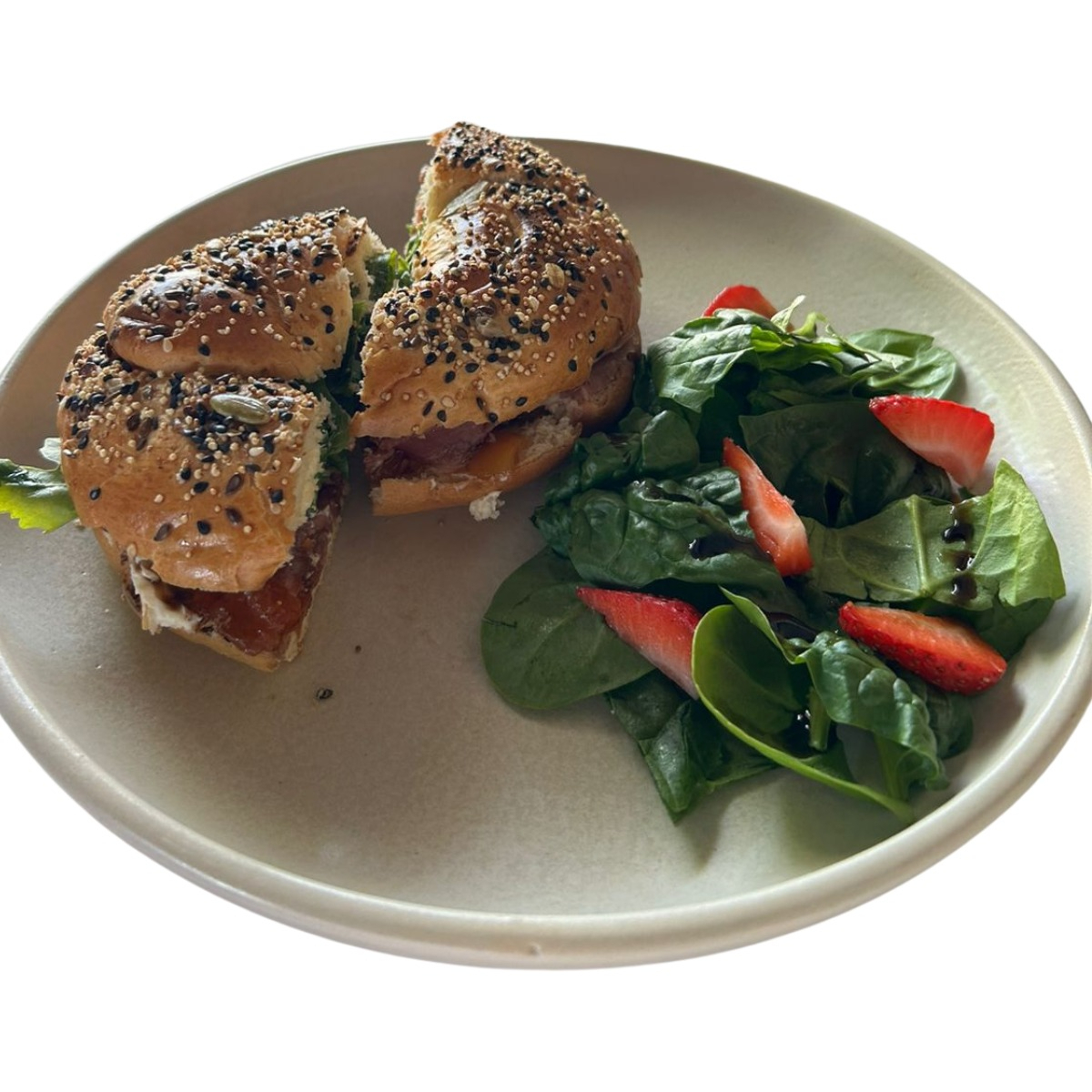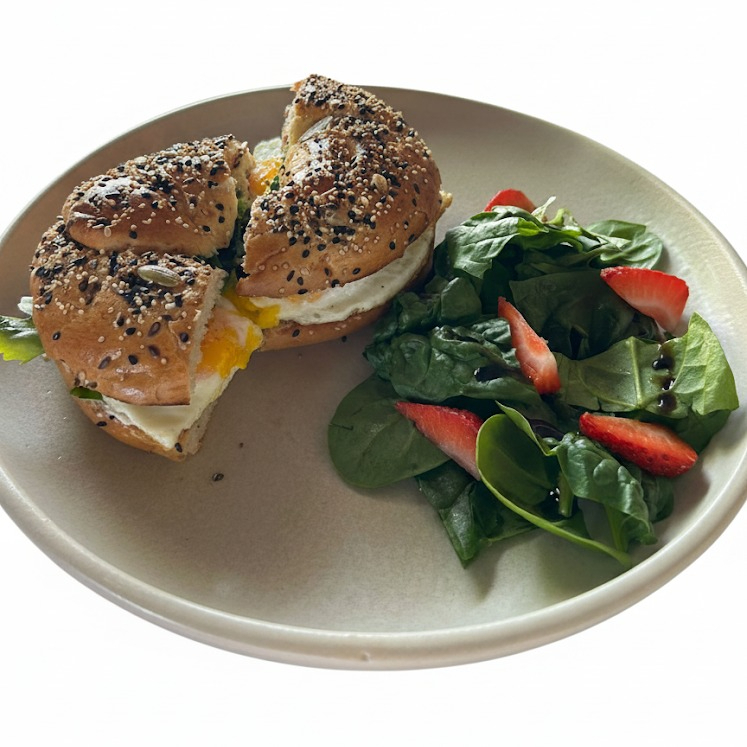 Pan bagel multigrano + huevo estrellado + cama de aguacate + espinaca salteada + germen de alfafa + ajonjolí
