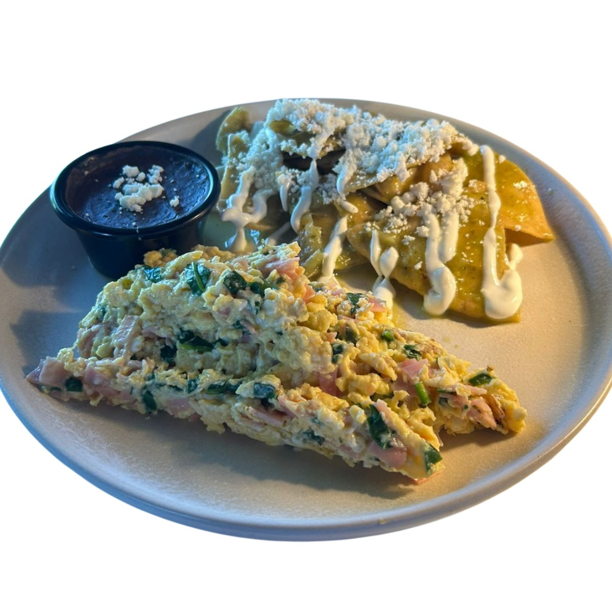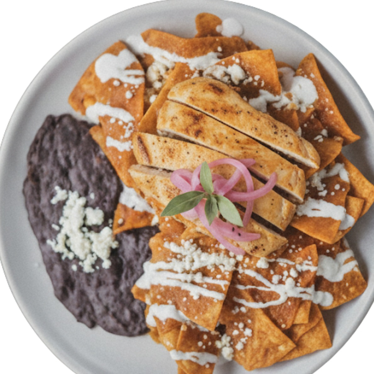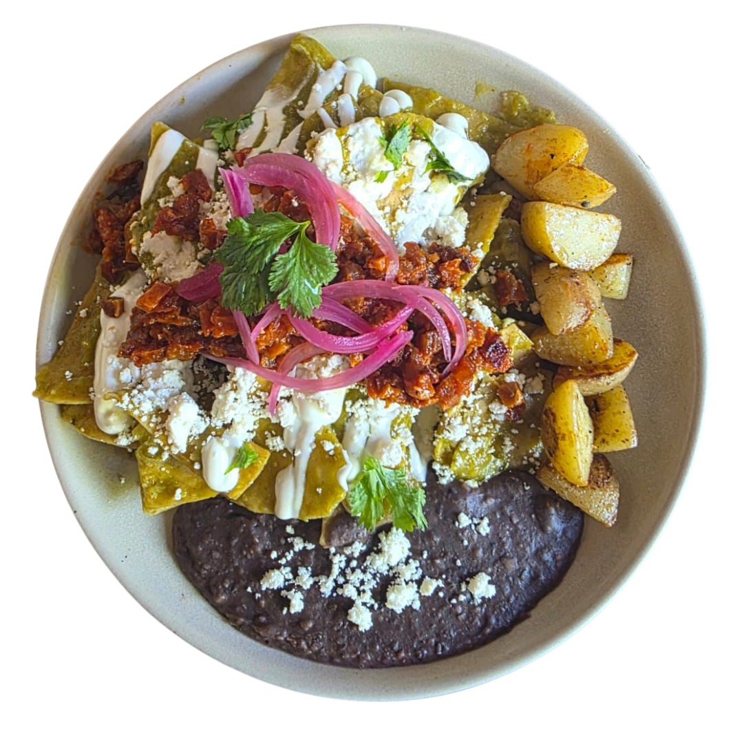 Tortilla frita en salsa verde o roja + frijoles refritos + crema + queso fresco + cebolla morada + cilantro