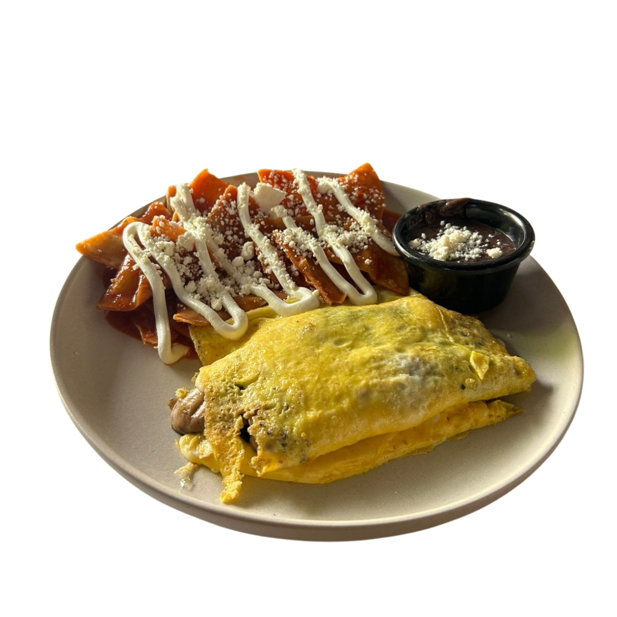 Huevo 3pzas + 2 ingredientes a elegir + queso mozzarela + guarnición de chilaquiles + frijoles refritos