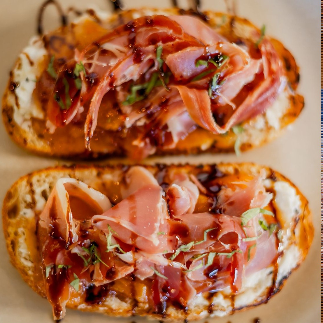 Hogaza masa madre + jamon serrano + reducción de balsámico + queso crema a las finas hierbas + compota de duraznos + eneldo