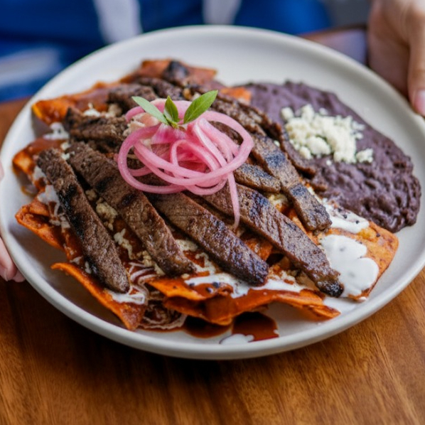Tortilla frita en salsa verde o roja + arrachera 90gr + frijoles refritos + crema + queso fresco + cebolla morada + cilantro