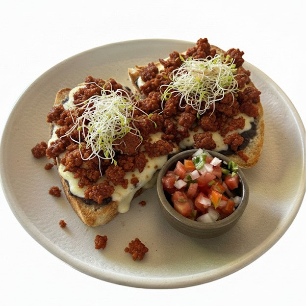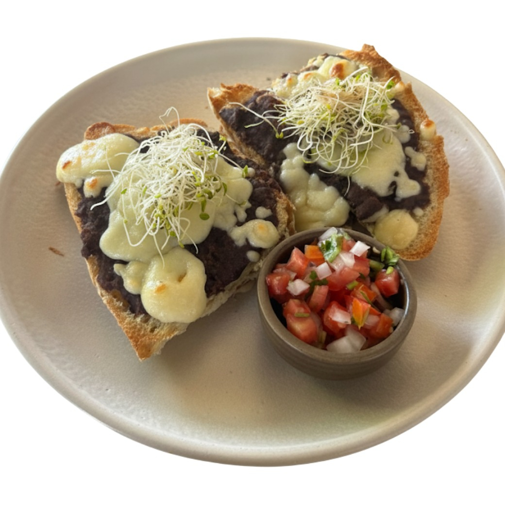 Bolillo + frijoles negros refritos + aguacate + queso gratinado + salsa mexicana