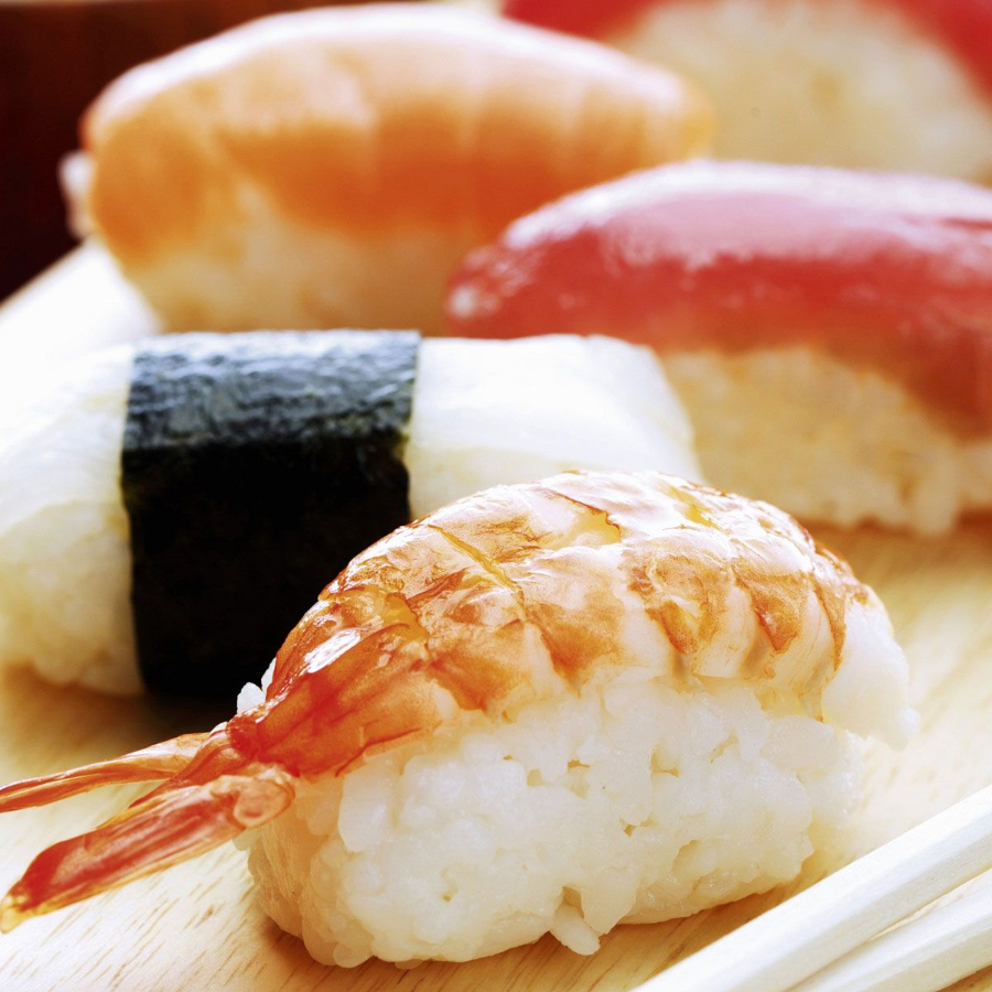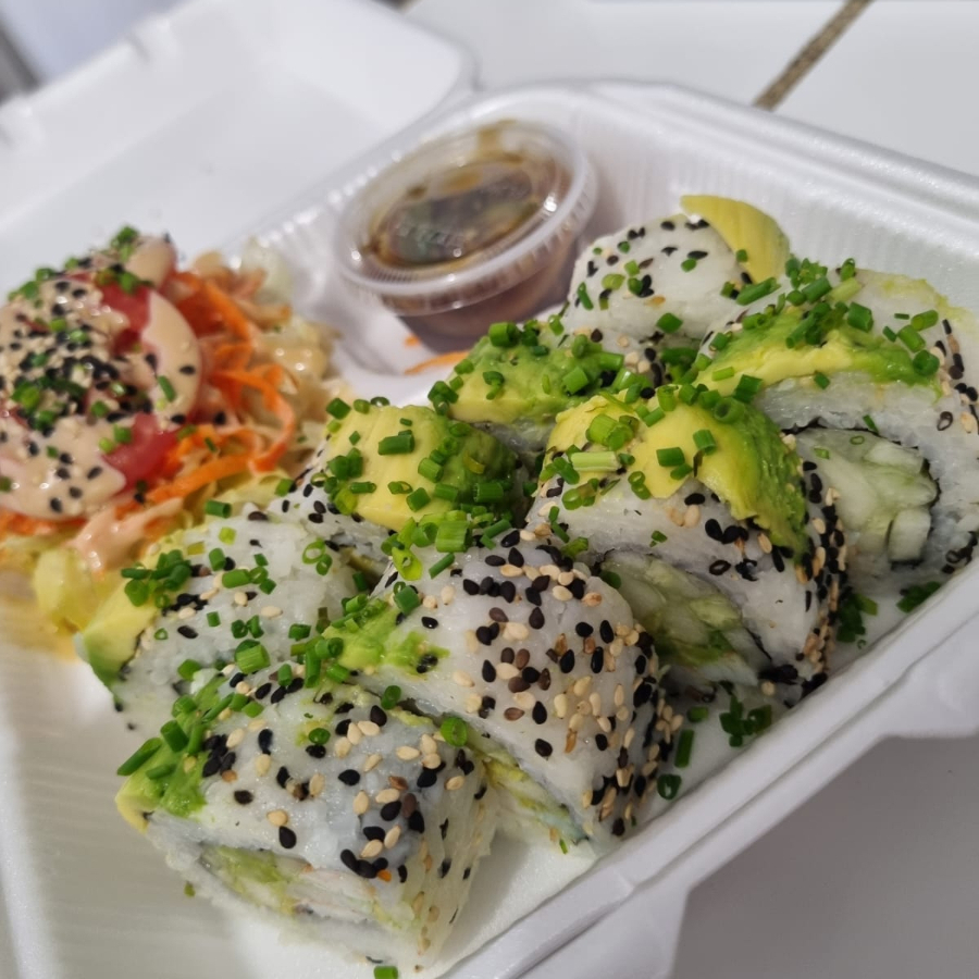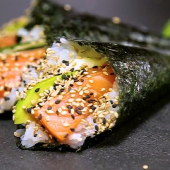 Cama de arroz, envuelta en alga. con proteina de eleccion, pepino, y ajonjoli