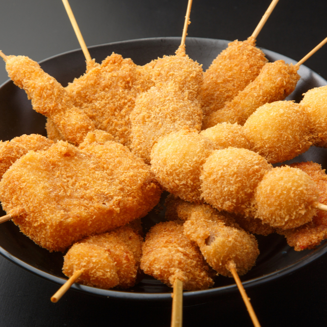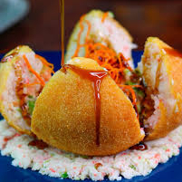 Bola de arroz empanizada, rellena de proteina, philadelphia y ensalada dinamita. coronada con aguacate, salsa anguila y ajonjoli