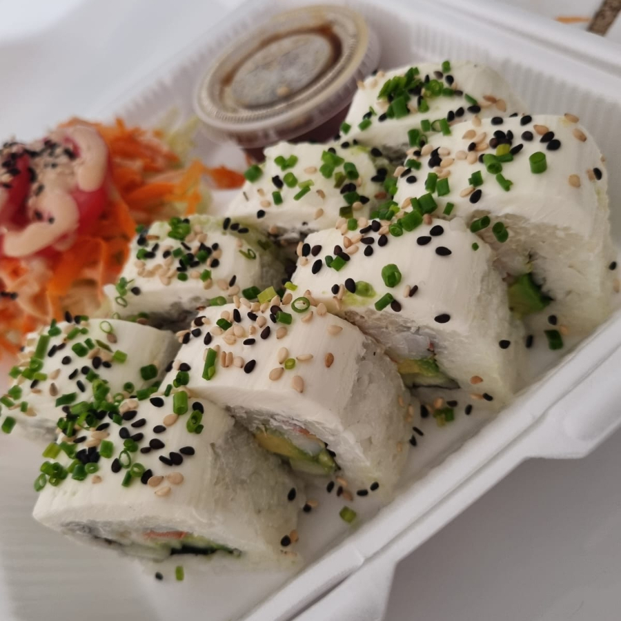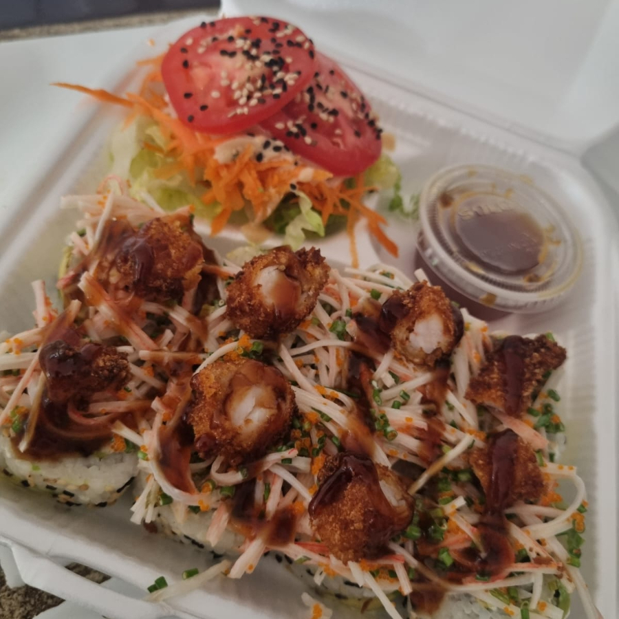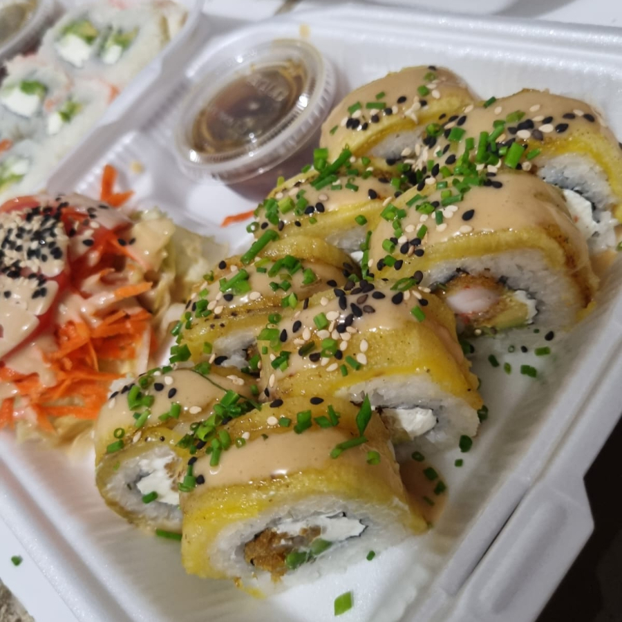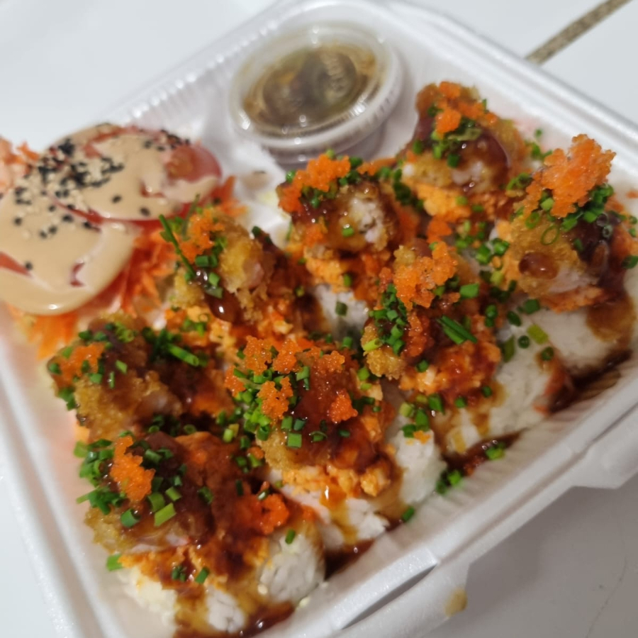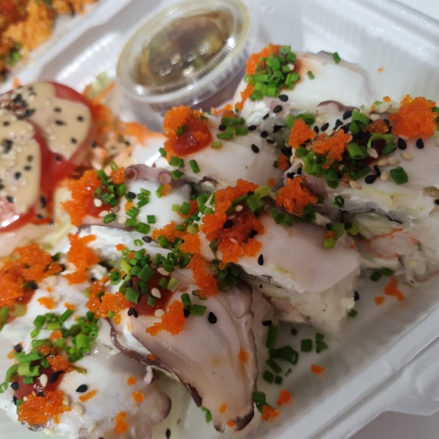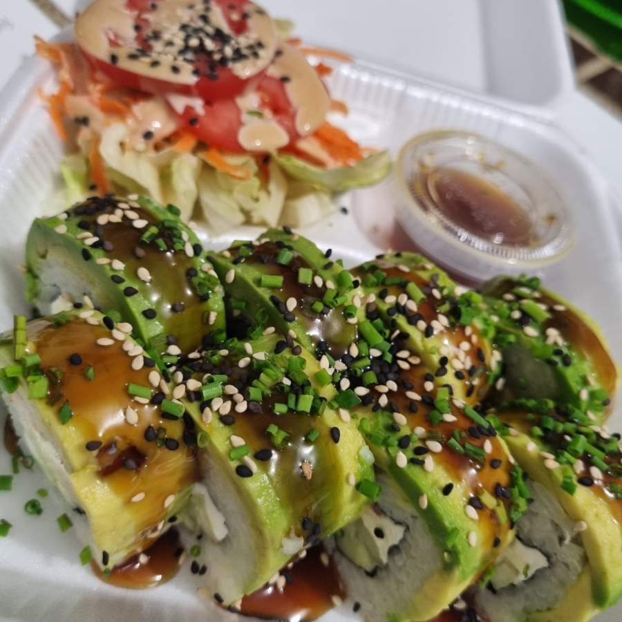 Camaron, pepino, aguacate y philadelphia. por fuera un topping de cangrejo, massago, cebollin, mayonesa japonesa. bañado en salsa anguila.