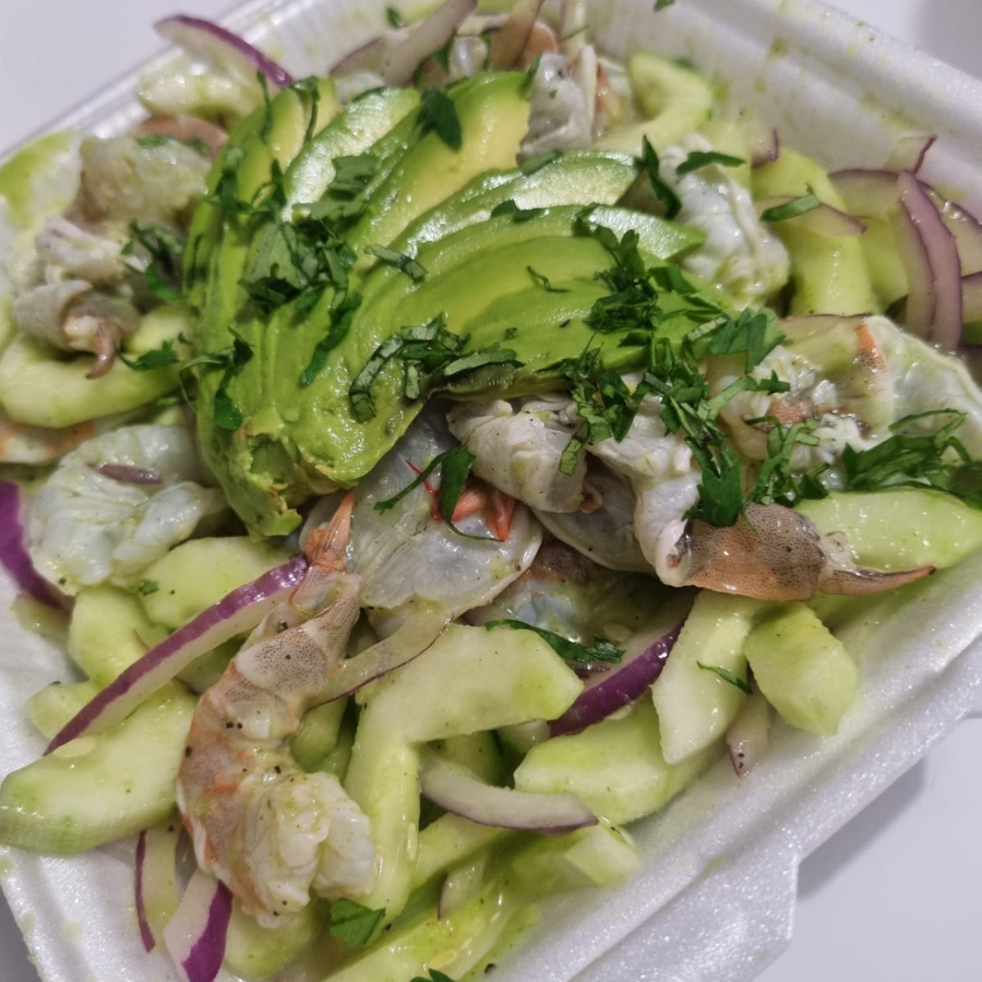 Base de camaron, pepino, cebolla, jitomate. bañado en salsa aguachile