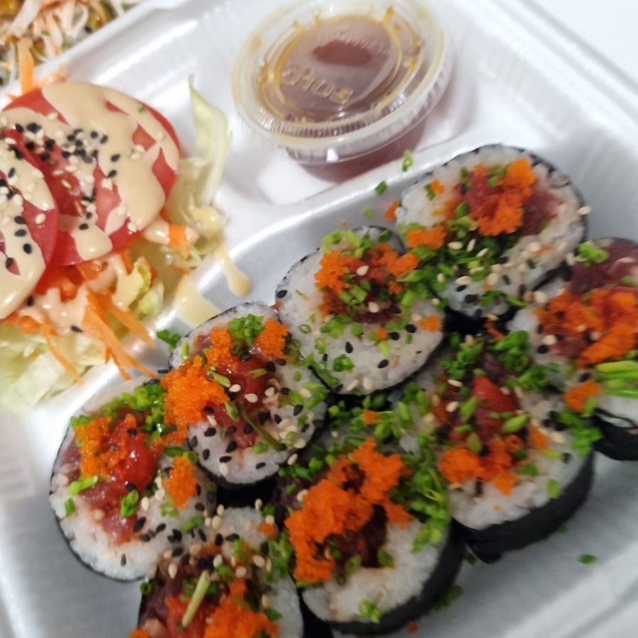 Arroz preparado con atun, massago, cebollin y mayonesa japonesa y alga picada.