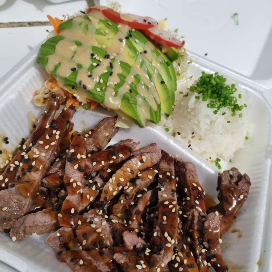 Ensalada (lechuga, zanahoria, germinado alfalfa, jitomate, aguacate) acompañado de arroz blanco y proteina. bañado con salsa teriyaki
