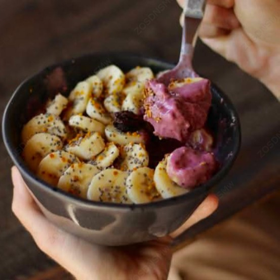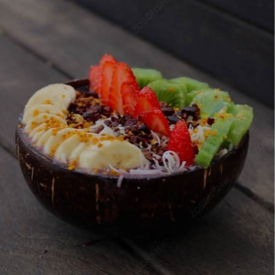 Açaí, mora azul, plátano, leche de almendra, toppings: granola, coco, fresa, kiwi, plátano, cacao nibs y polen.