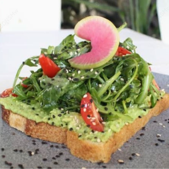 Pan de masa madre, aguacate, arúgula, limón, jitomate cherry, aceite de oliva, sal, pimienta y ajonjolí.