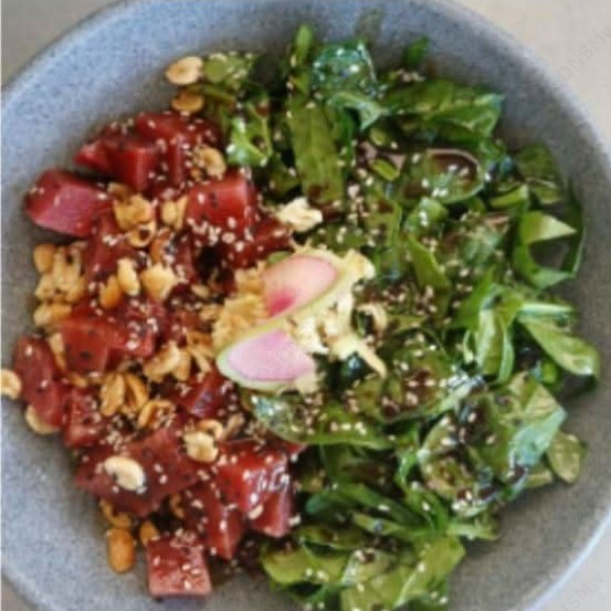 Espinacas, quinoa, arroz, atún, cacahuate, ajonjolí, cebollín, jengibre, teriyaki y salsa de soya.