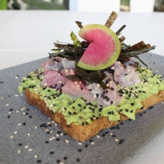 Pan de masa madre, aguacate, limón, atún, alga nori, sal, pimienta y ajonjolí.