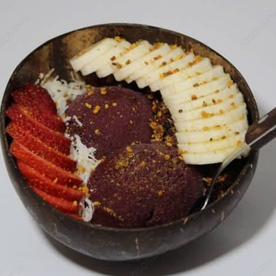 Açaí sorbet, toppings: granola, coco, fresa, plátano, mora azul y polen.