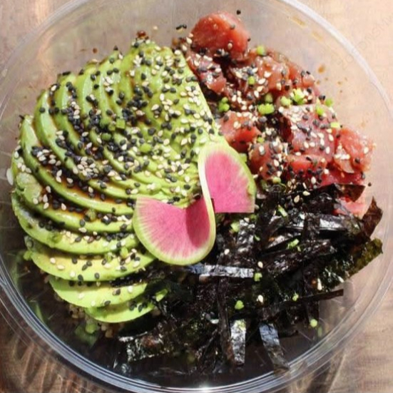 Arroz, quinoa, atún, aguacate, algas, ajonjolí, cebollín, teriyaki y salsa de soya.
