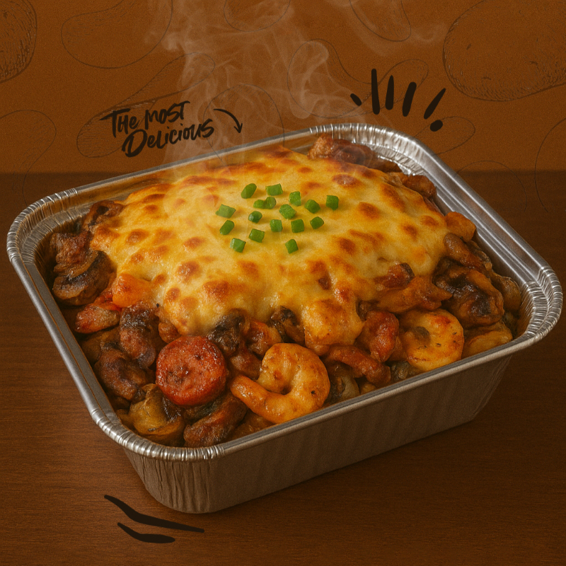 Papa Horneada al punto perfecto con todo lo bueno: camarón jugoso, arrachera asada, chorizo bien doradito, tocino crujiente y champiñones. Todo bañado en un dip de cebollin y gratinados quesos qué se derriten y crujiente a la vez.🥔🔥🦐🥩🥓🍄🟫🧀