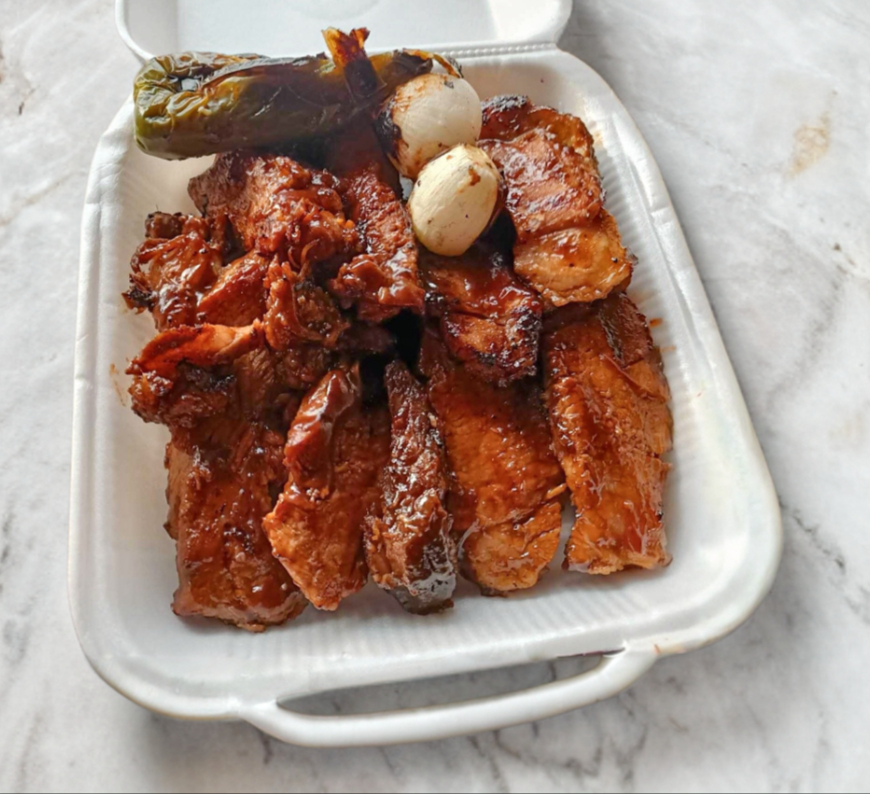 cuarto de arrachera , cuarto de costillitas bbq , cuarto de pollo , una pieza de chorizo