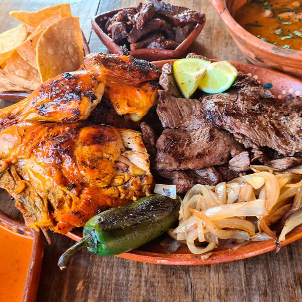 1/2 sirloin, 1/2 asada, 1/2 arrachera, 2 piezas de chorizo, acompañado de salsas, frijoles charros, 1/4 tortillas, chile y cebolla toreados.