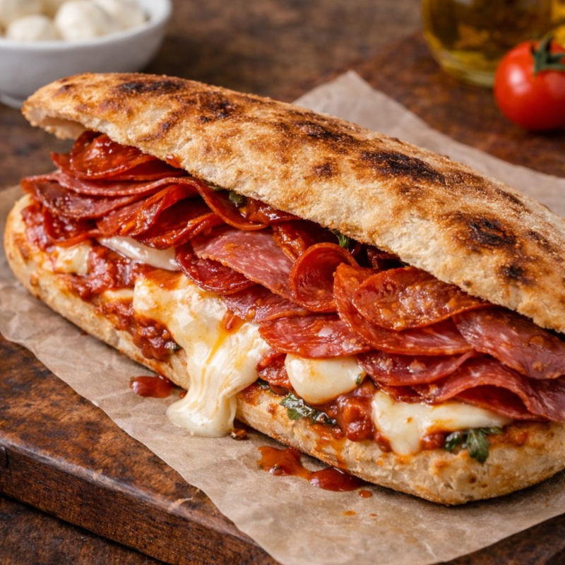 Base de masa aereada acompañado con salsa pomodoro san marzano, queso mozarella fresco, salami italiano, pepereni picanti, untado con alioli de ajo confitado y acompañado con reduccion de balsamico.
