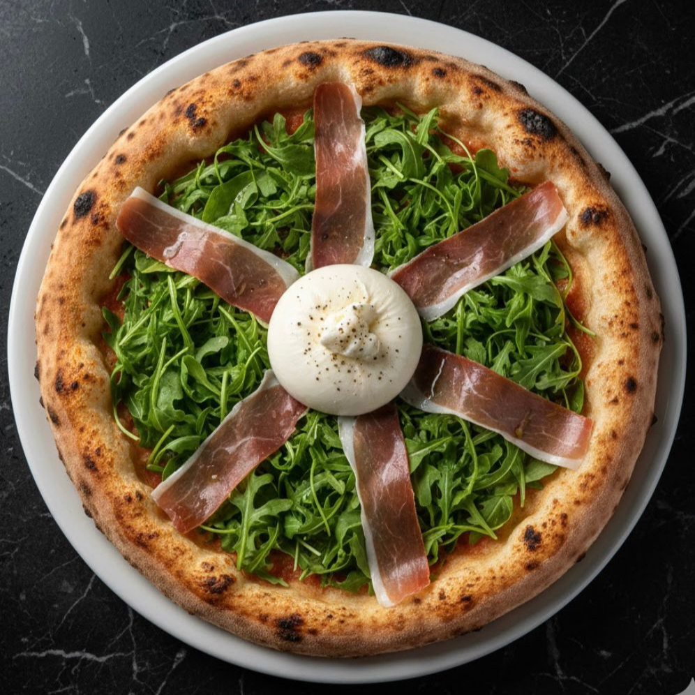 Base de masa areada, con pomodoro san marzano,Jamon curado italiano, queso burrata cremoso, arugula baby fresca y mozzarella