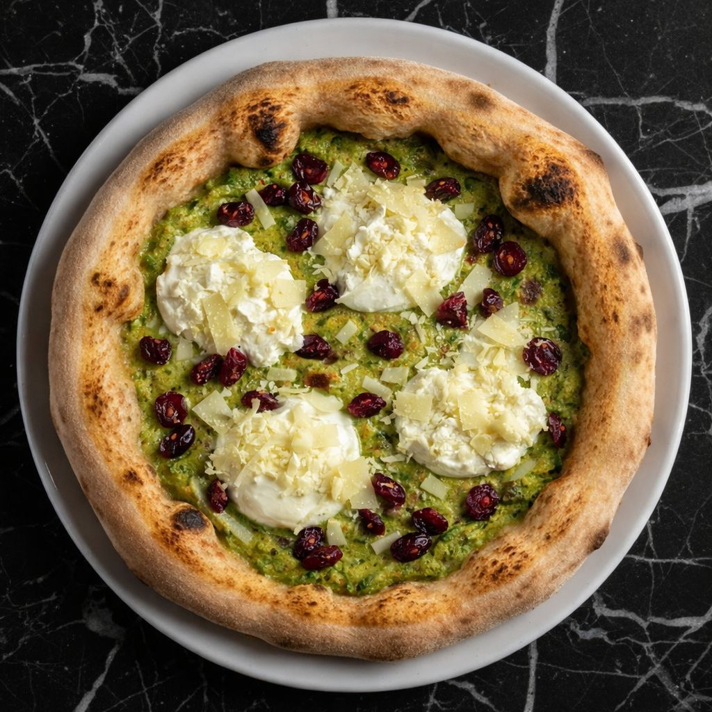 Base de masa areada, con embulsion de calabaza asada y crema lincon, queso riccota, queso parmesano reggiano, Arandanos, queso mozzarella y queso azul.