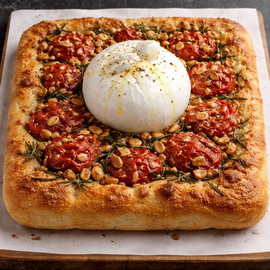 Base de masa areada bañada de aceite ajo perejil, encima jitomate escalfado marinado en aceite de oliva, romero, albahaca,cacahuate y queso burrata