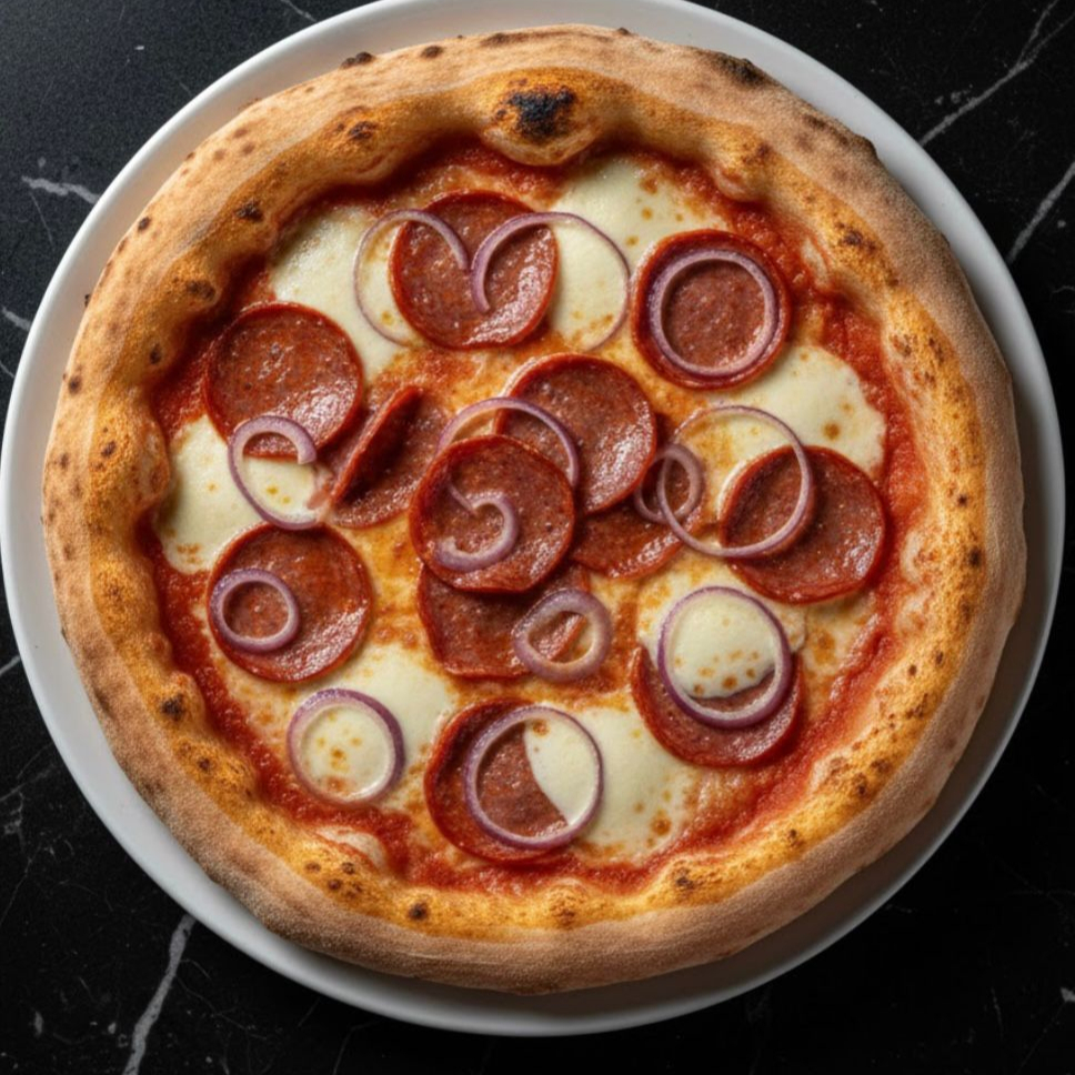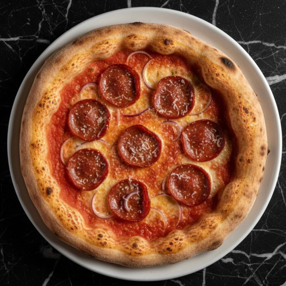 Base de masa areada, con pomodoro san marzano, salame napolitano, peperoni picanti, mozzarella, champiñones y cebolla morada.