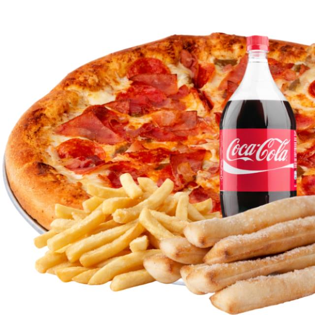 Pizza carnívora con abundante variedad de carnes, acompañada de palitos parmesano, papas a la francesa y refresco. Ideal para los más antojados.