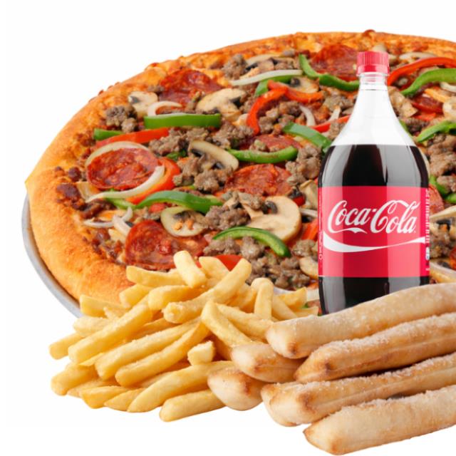 Pizza suprema con balance perfecto entre carnes y vegetales, acompañada de palitos parmesano, papas y refresco. Un clásico que nunca falla.