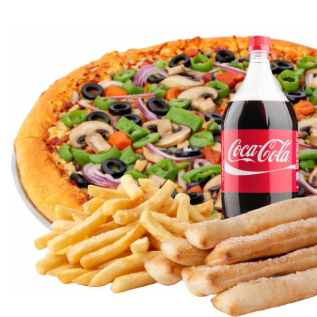 Pizza suprema con orilla rellena de queso, acompañada de palitos parmesano, papas y refresco. Vegetales frescos con un extra de queso.