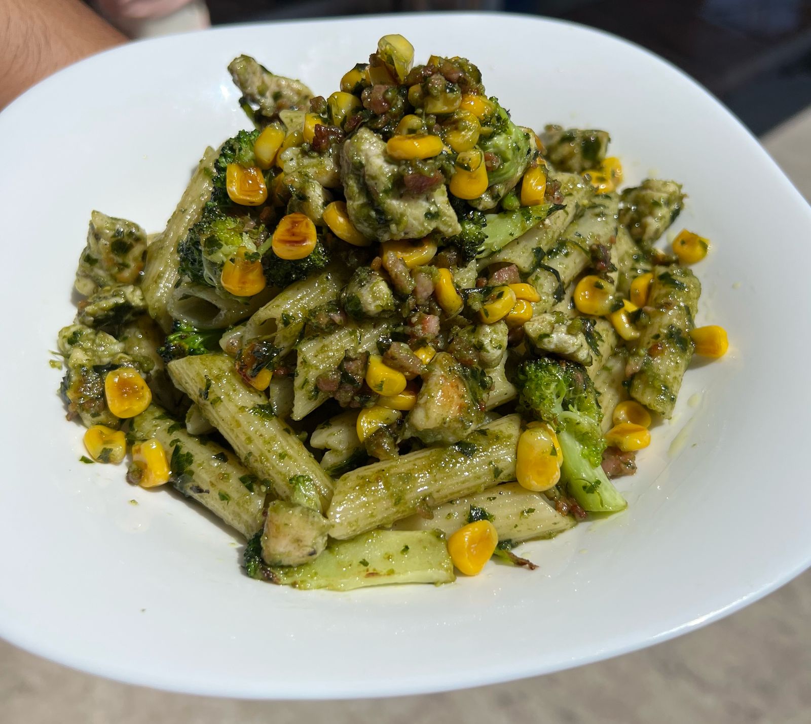 Salsa pesto con tocino, pollo, brócoli y elote.