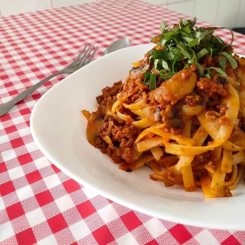Deliciosa carne bolognesa hecha en casa con salsa marinara y champiñones.