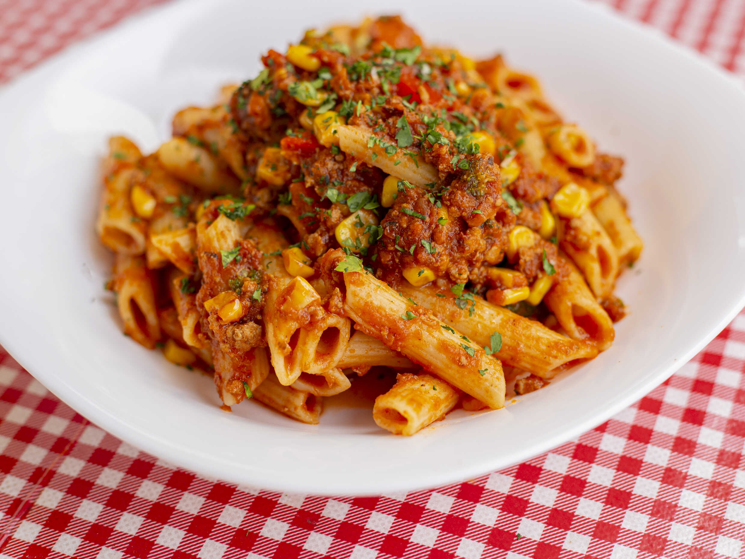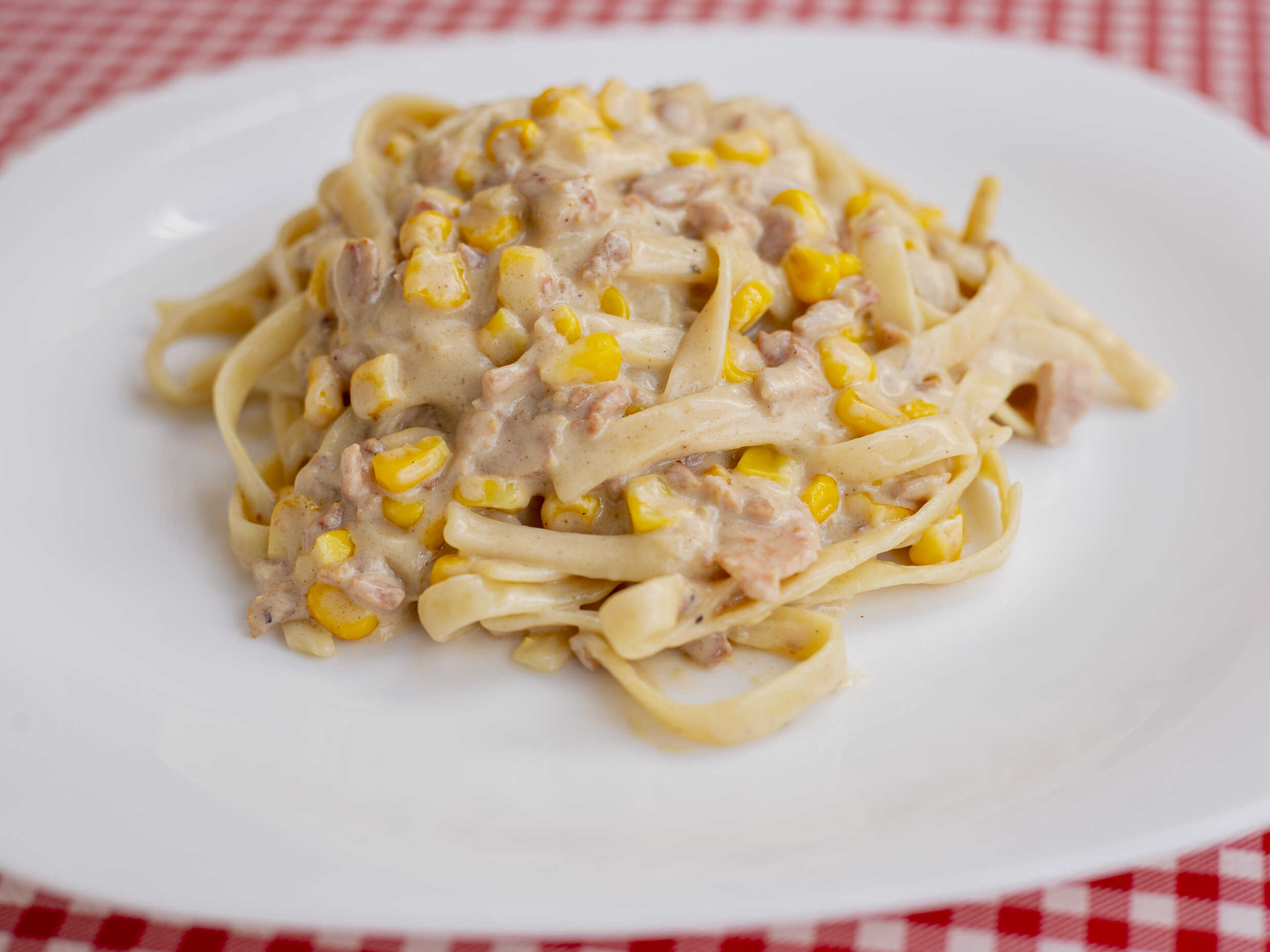 Salsa Alfredo con tocino y elote.