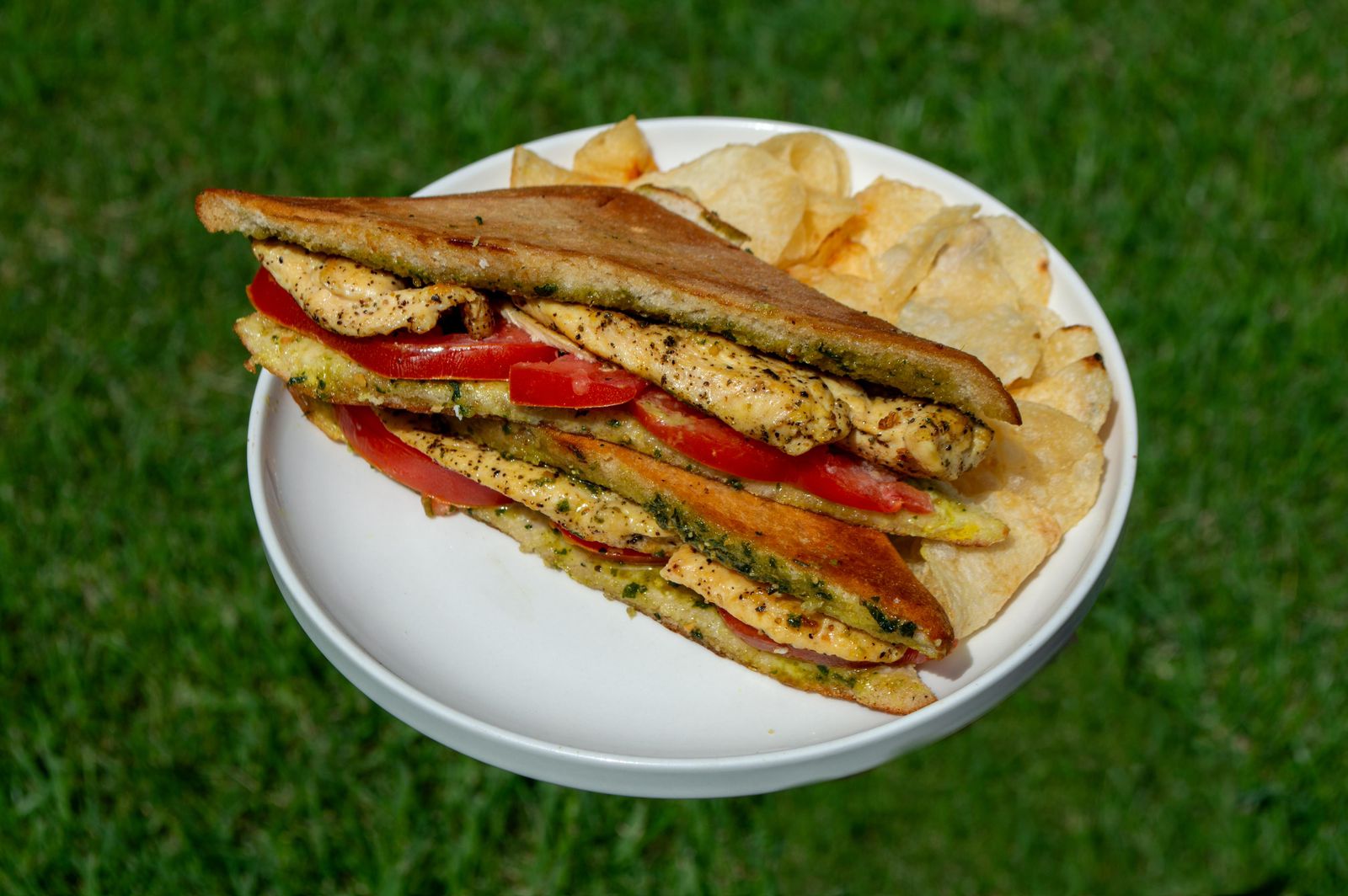 Panini de pollo a la plancha con jitomate y salsa pesto.