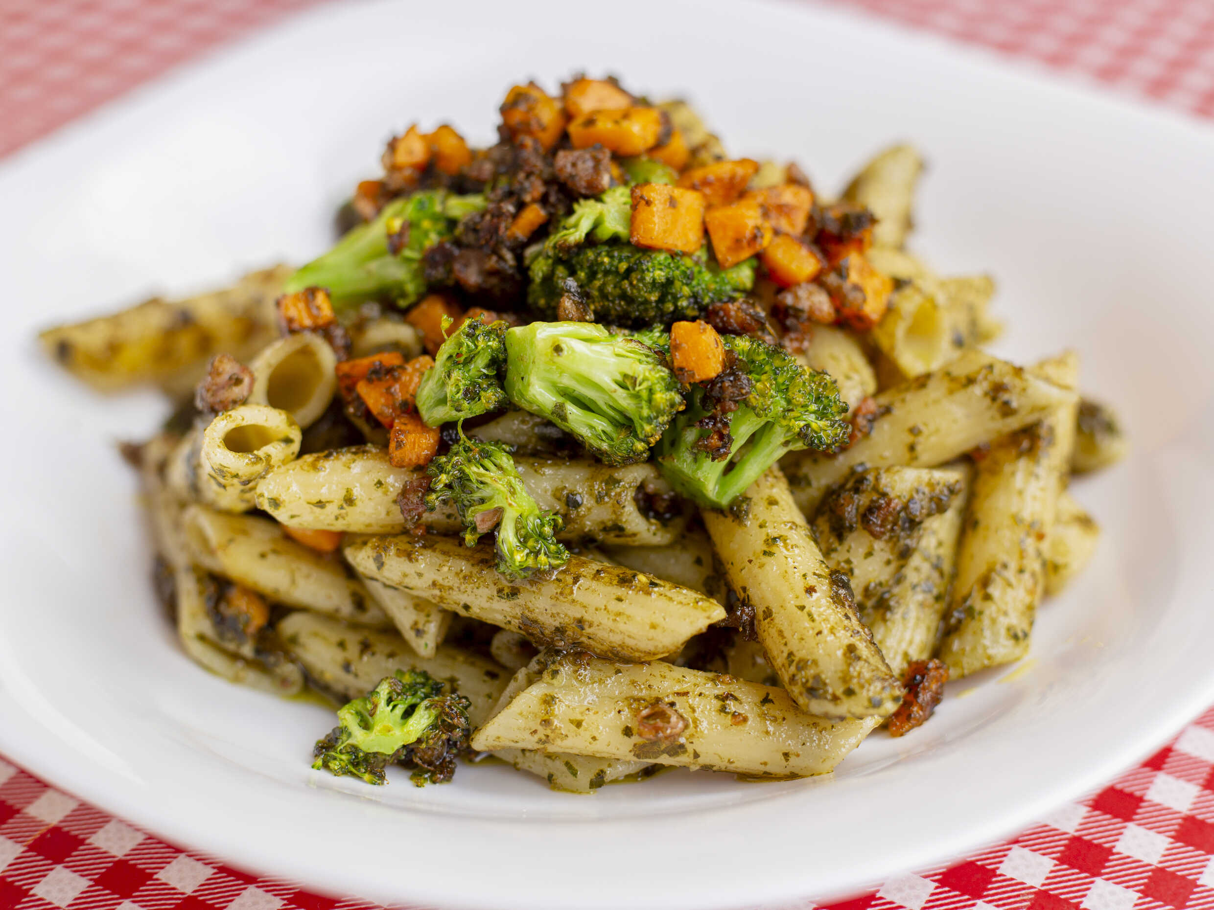 Salsa pesto elaborada con albahaca fresca, tocino crujiente, zanahoria y brocoli. Elige Pan con ajo ó Ensalada de espinacas. Elige Agua