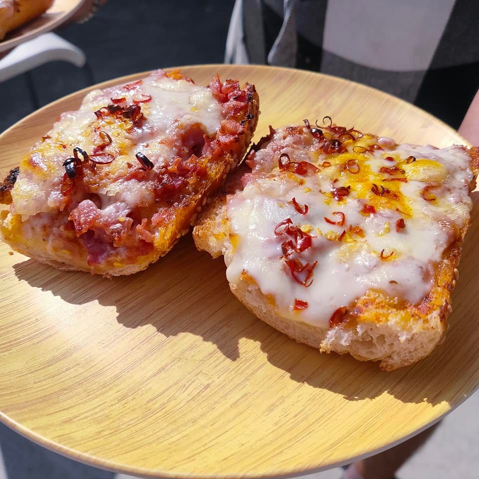Bolillo doradito con tocino y queso mozzarella derretido.