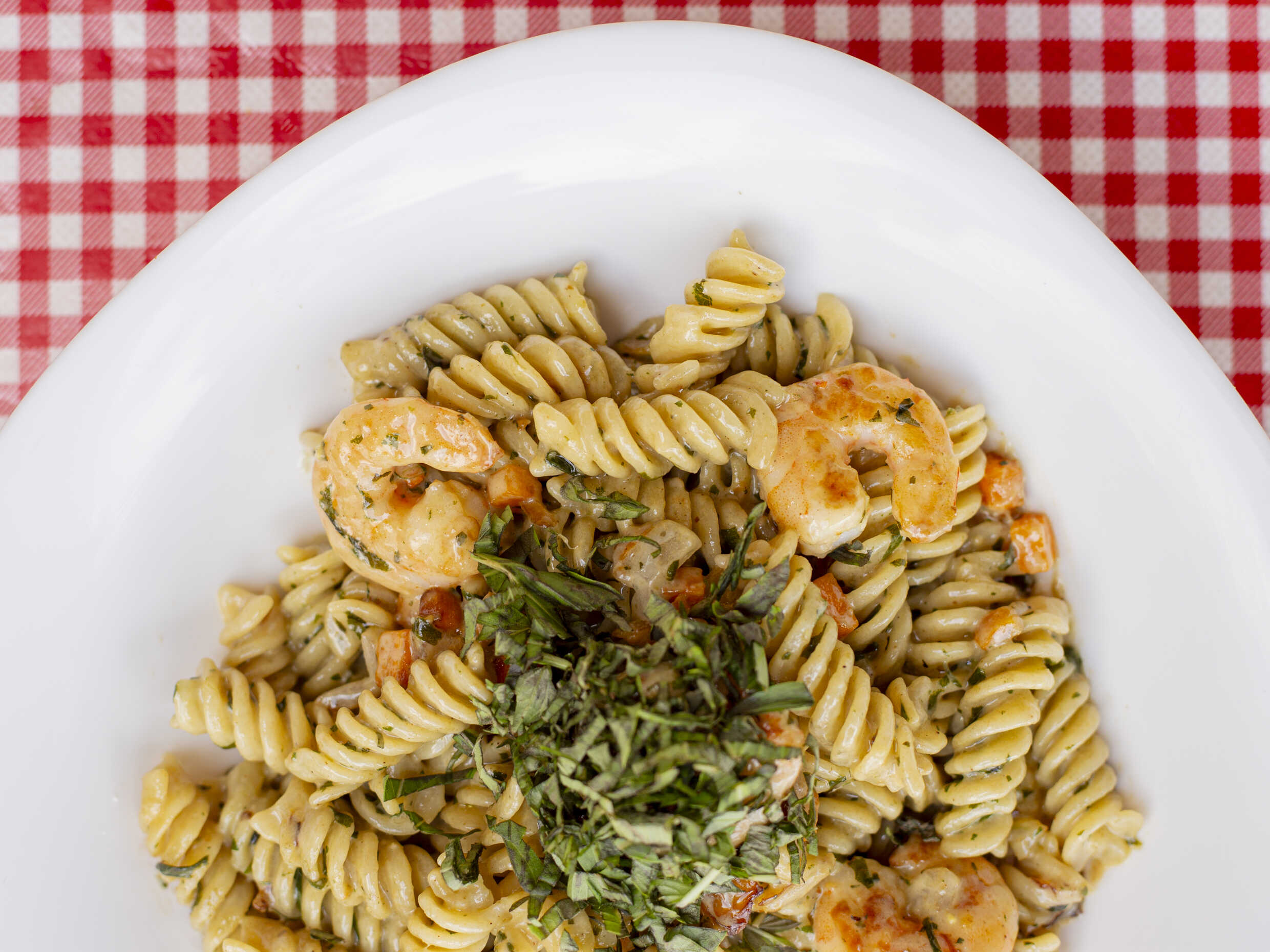 Salsa combinada de Alfredo y Pesto, camarones salteados con zanahoria y cebolla. Elige Pan con ajo ó Ensalada de espinacas. Elige Agua