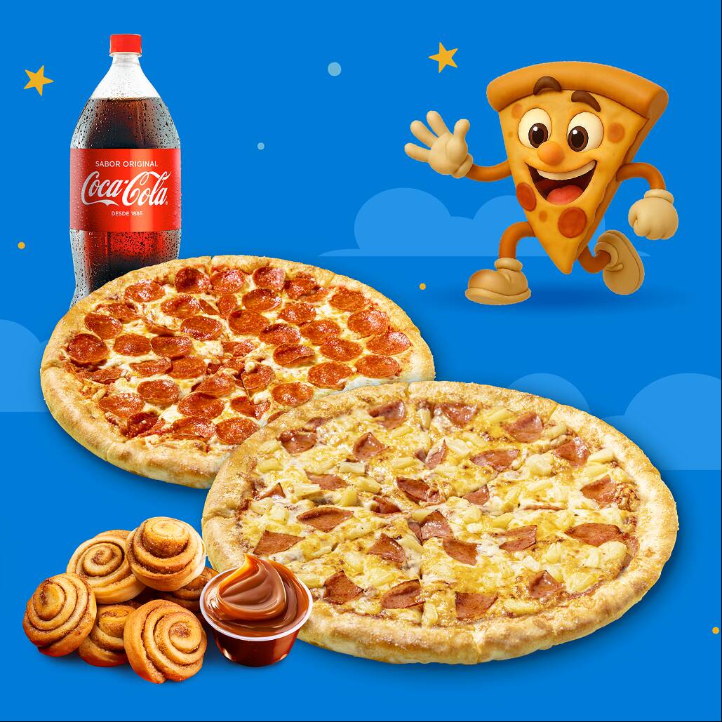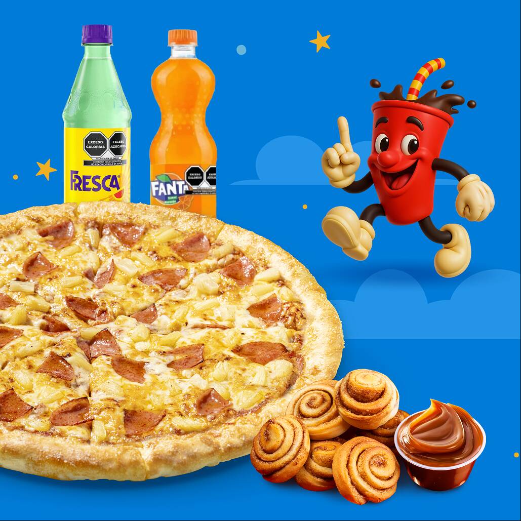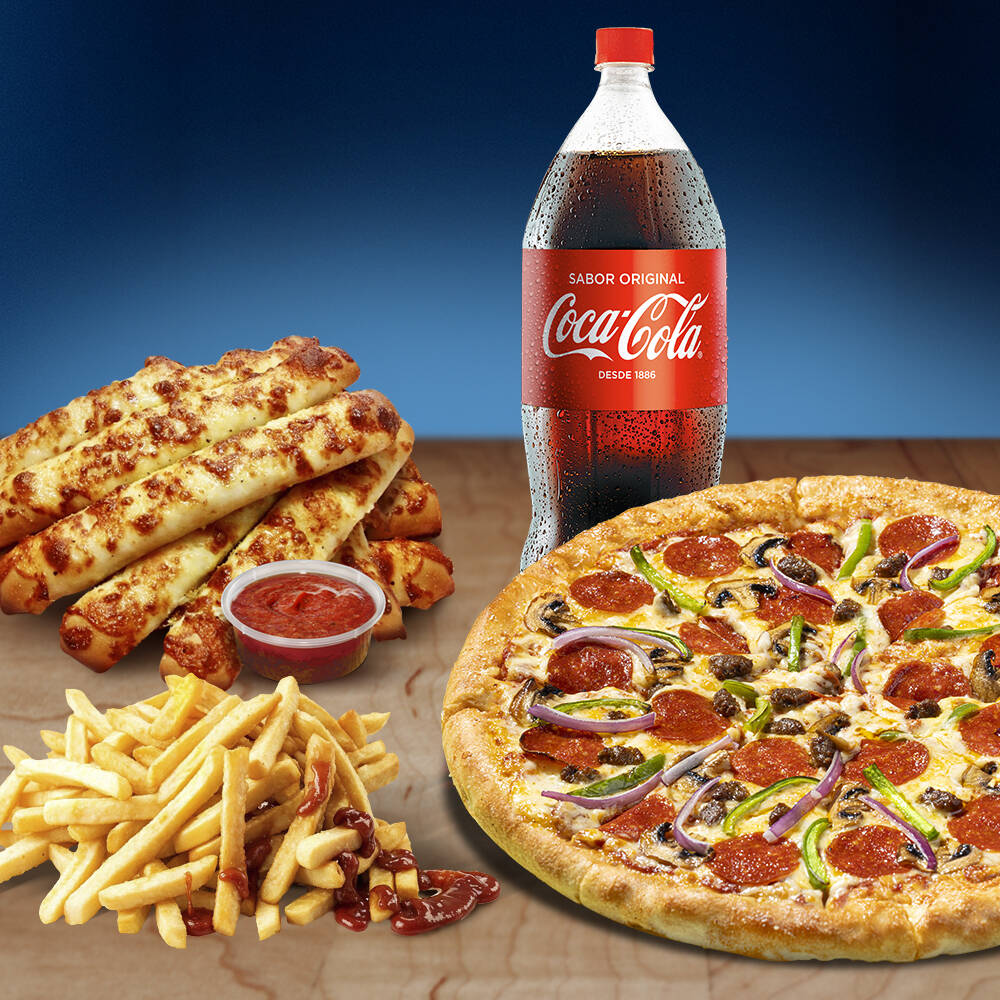 Una pizza de especialidad, un refresco familiar, unas pinpon papas y unos deliciosos palitos parmesano.