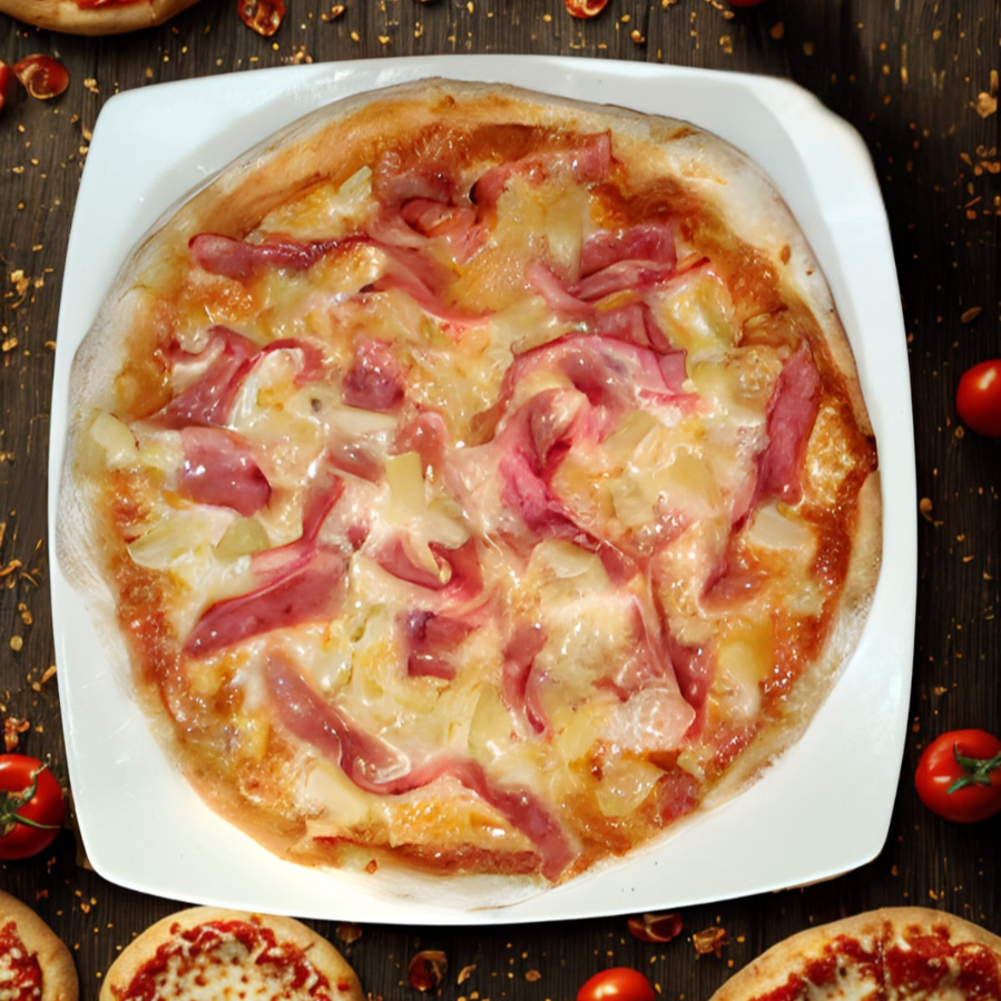 Salsa de jitomate casera, Queso, Jamón, Piña y aceite de olivo